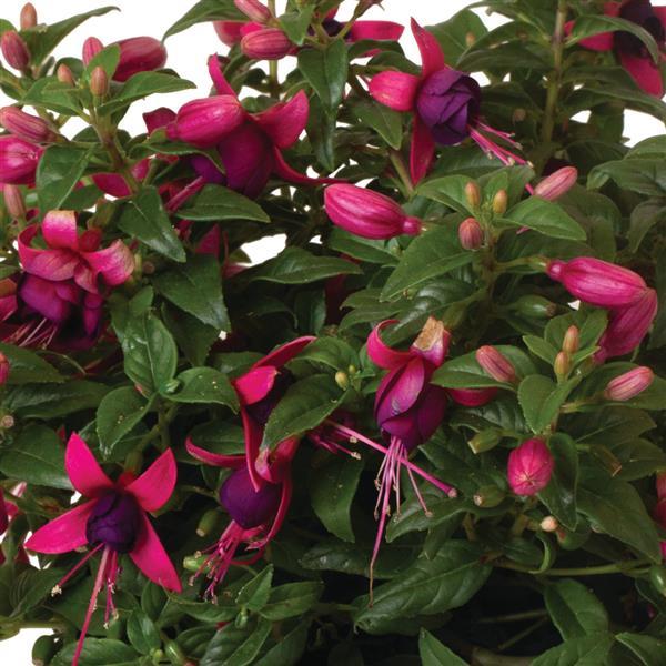 Fuchsia ‘Ballerina Balance’ features elegant, ballerina-shaped blooms in soft light pink and deep purple that flower continuously all season. A favorite of hummingbirds and butterflies, this variety adds graceful movement and color to shaded spaces.