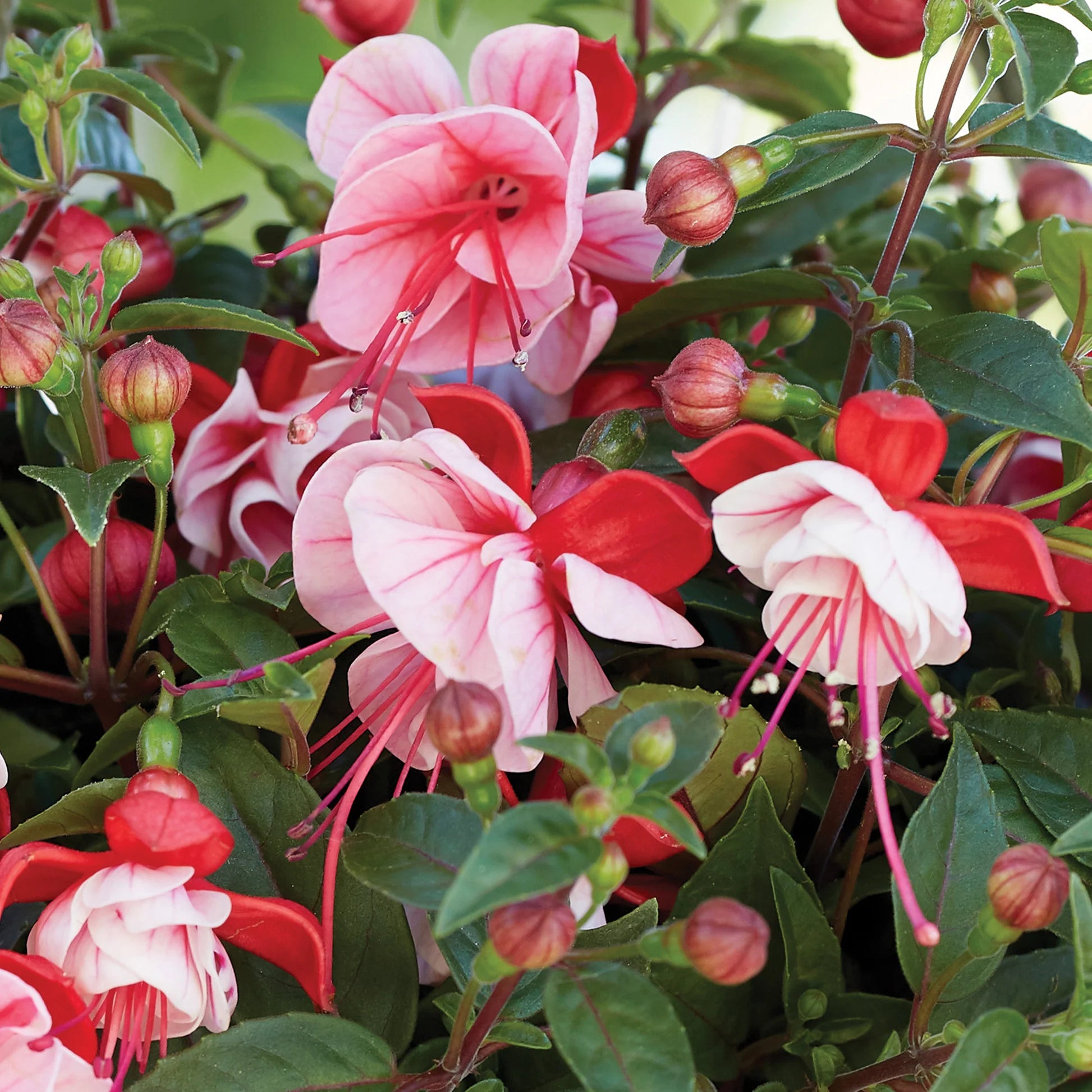 Bella Laura is a beautiful semi-trailing fuchsia featuring striking red and white double blooms that dangle like delicate lanterns. The layered petals create extra fullness and contrast, giving baskets a soft, romantic look with plenty of dimension.