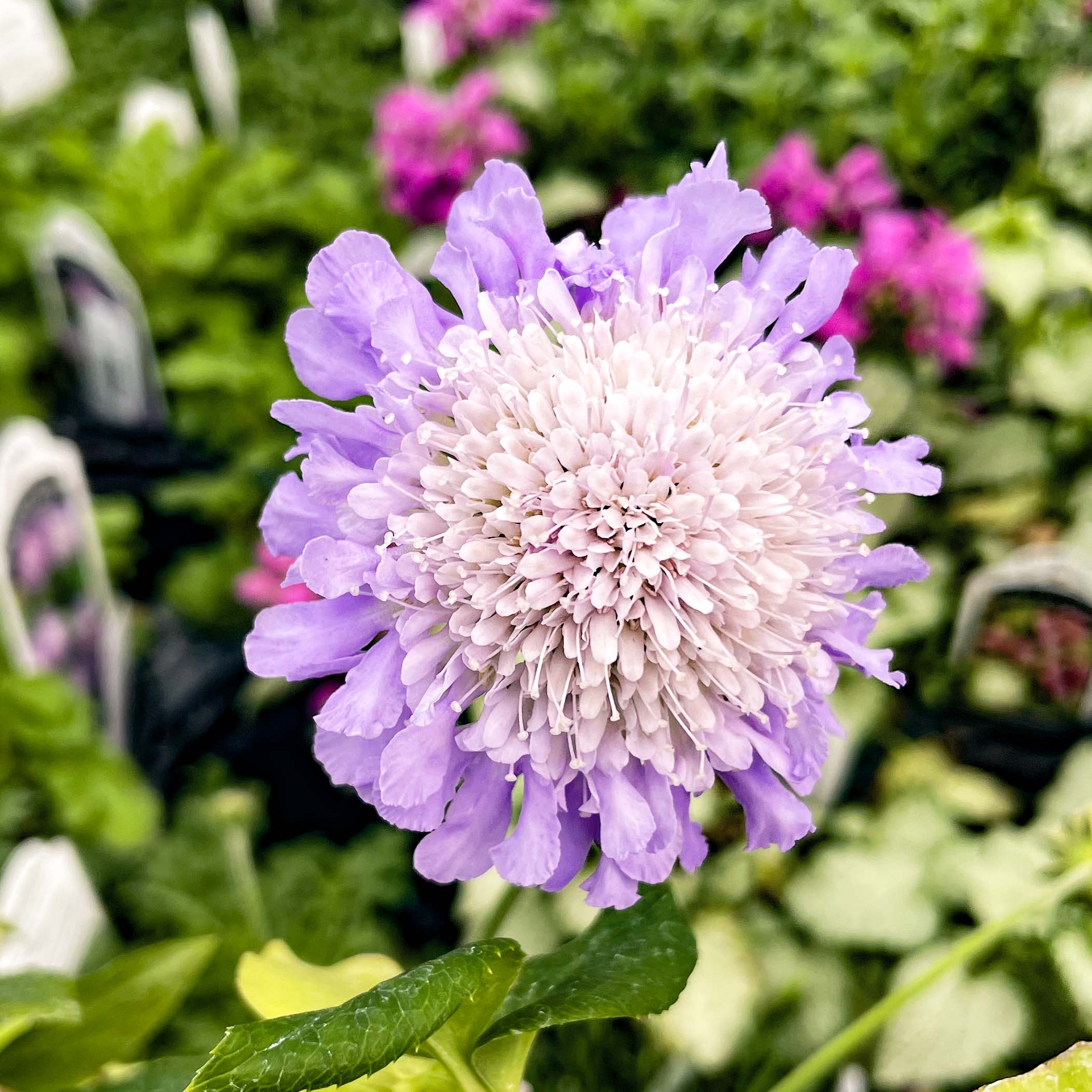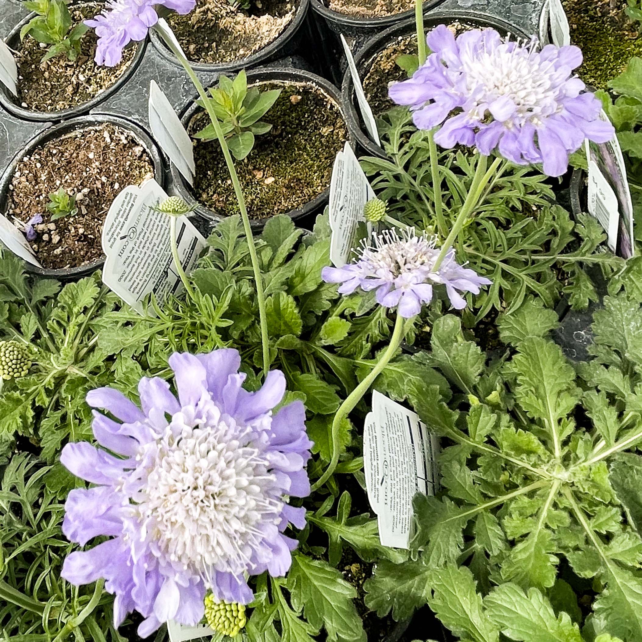 This selection produces a profusion of lavender-blue, pincushion-like flowers over a very long period beginning in late spring. They sit atop wiry stems which hover over the short mound of ferny basal foliage. They make excellent cut flowers and also attract butterflies.