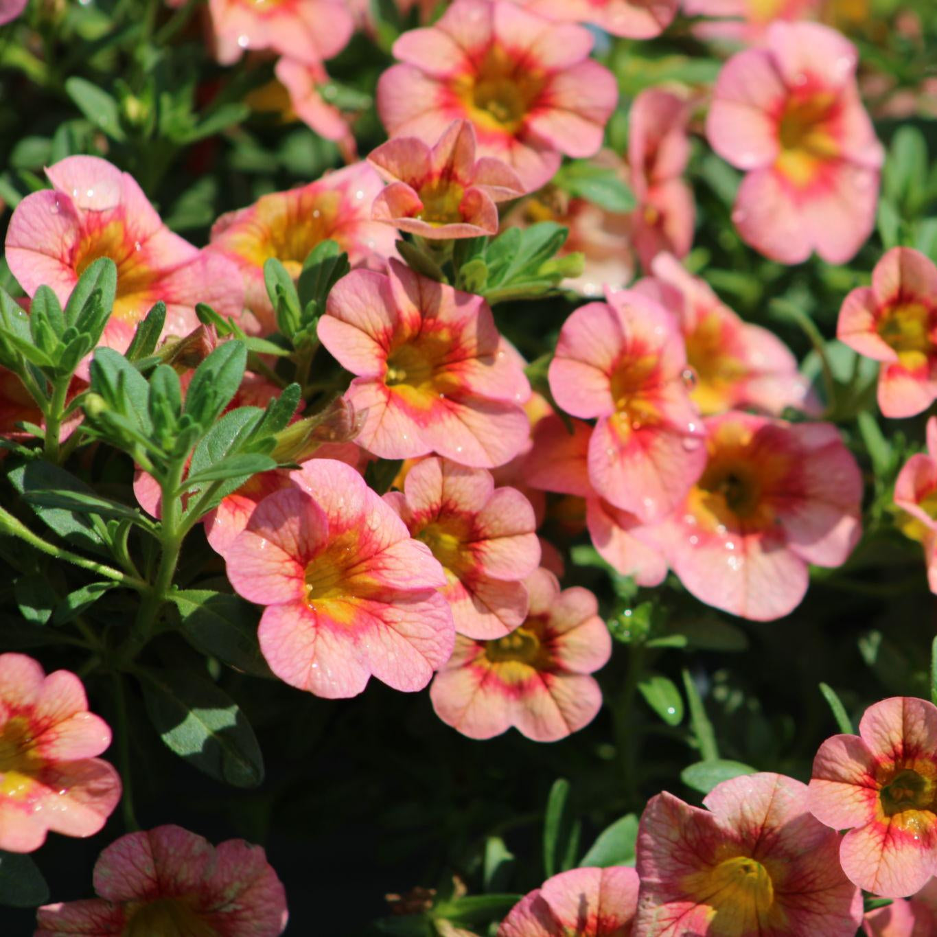 Calibrachoa ‘Ombre Pink’ features beautiful bi-color blooms in soft medium pink with light yellow centers, creating a cheerful, blended look. This semi-trailing variety grows about 12–14 inches tall and 12–16 inches wide, making it ideal for hanging baskets and patio containers.