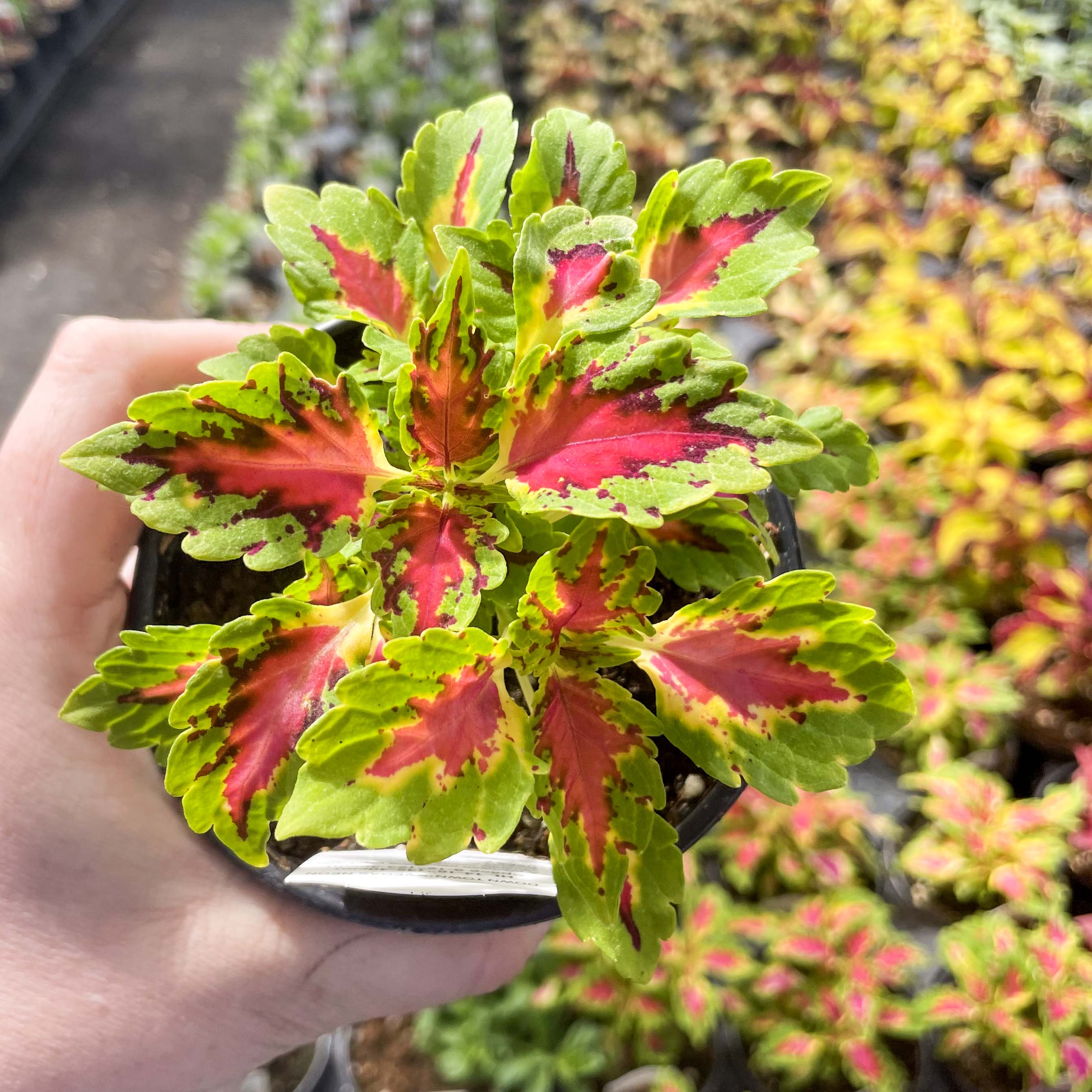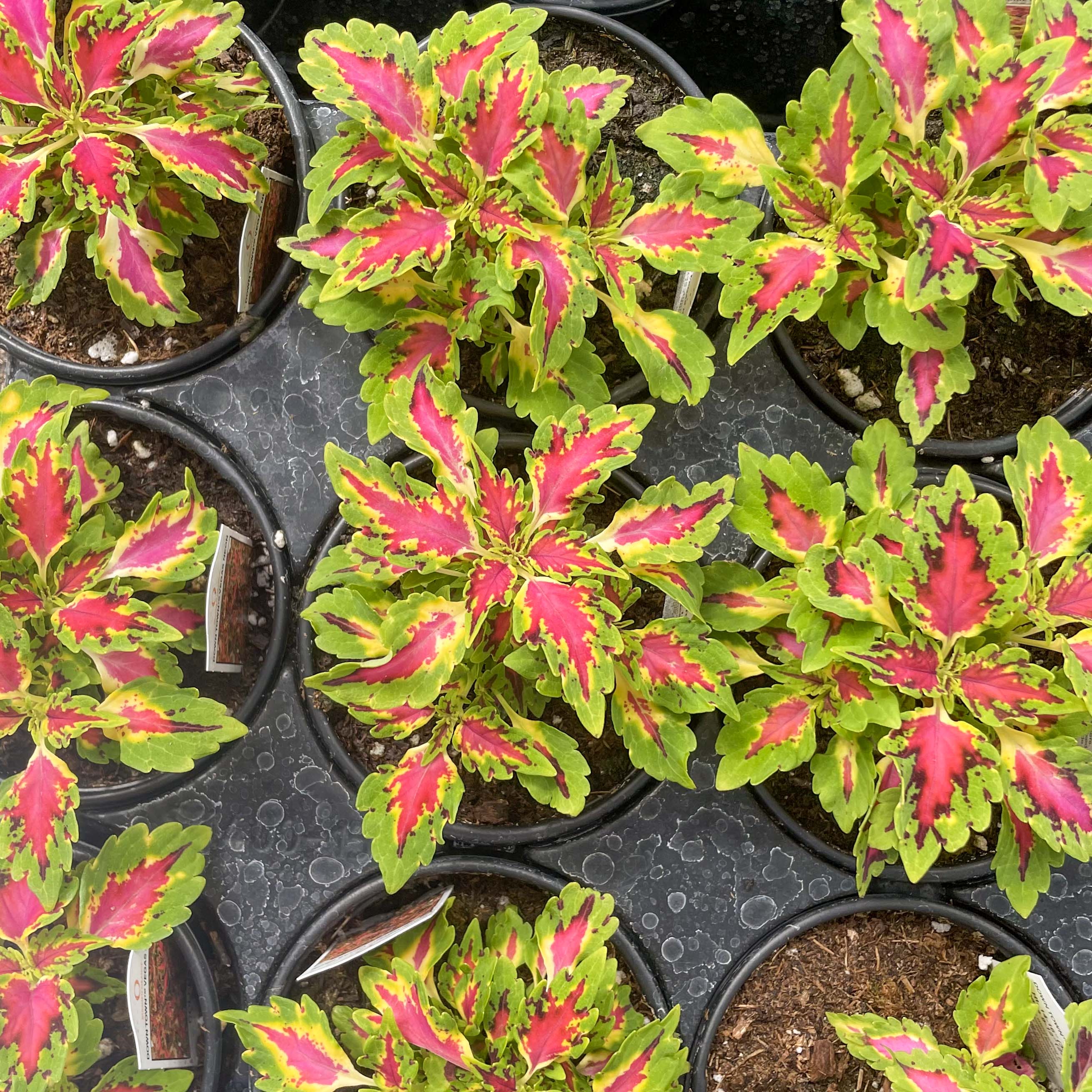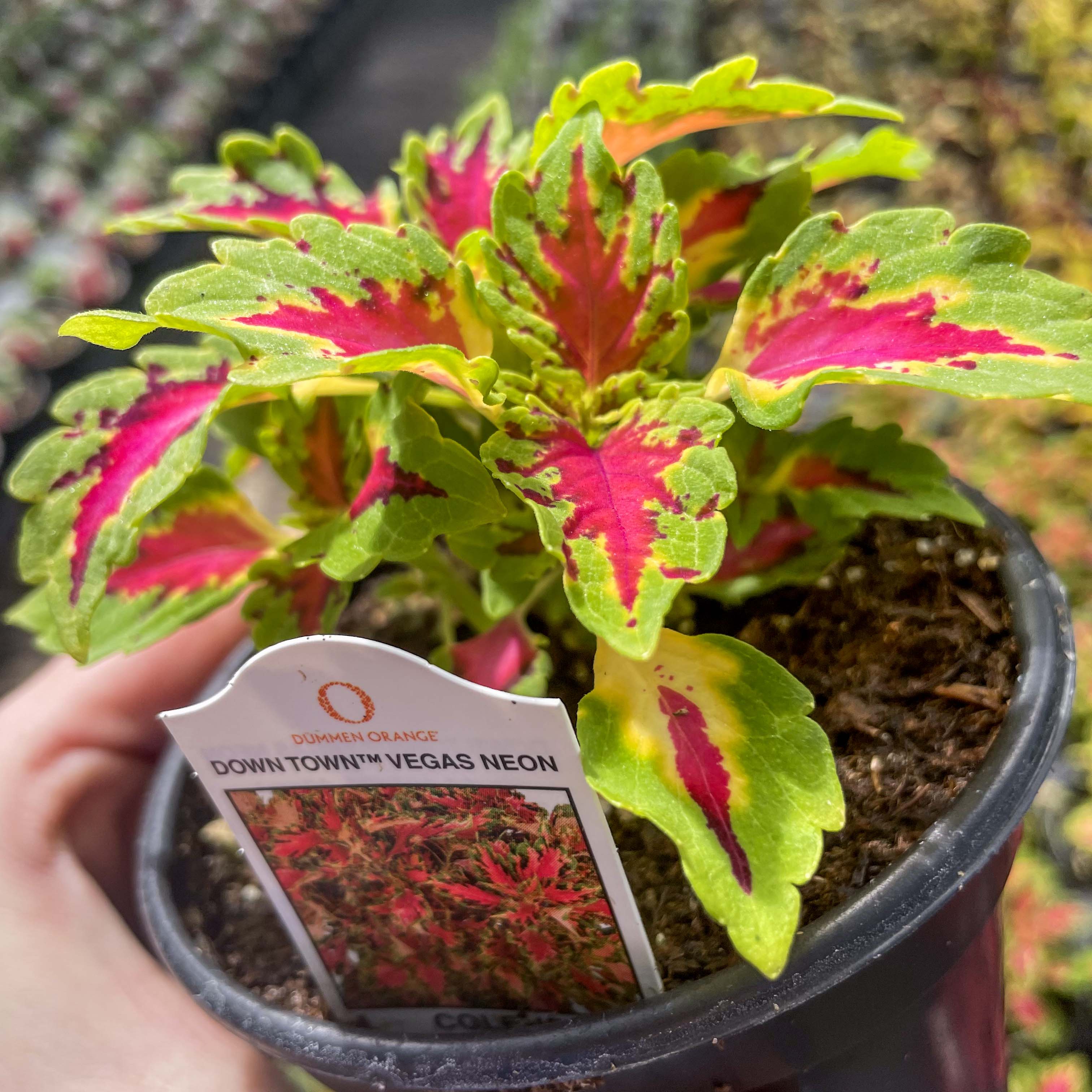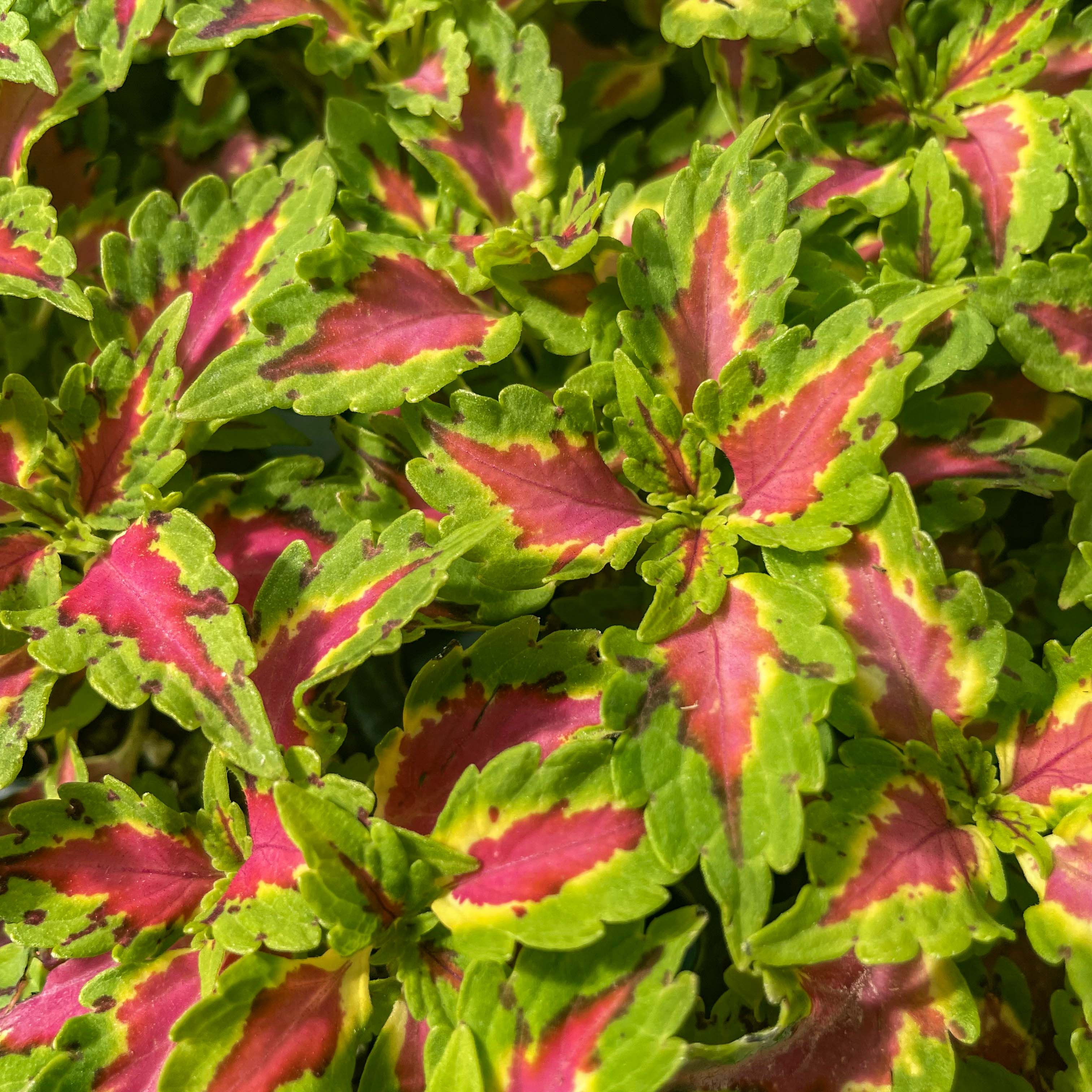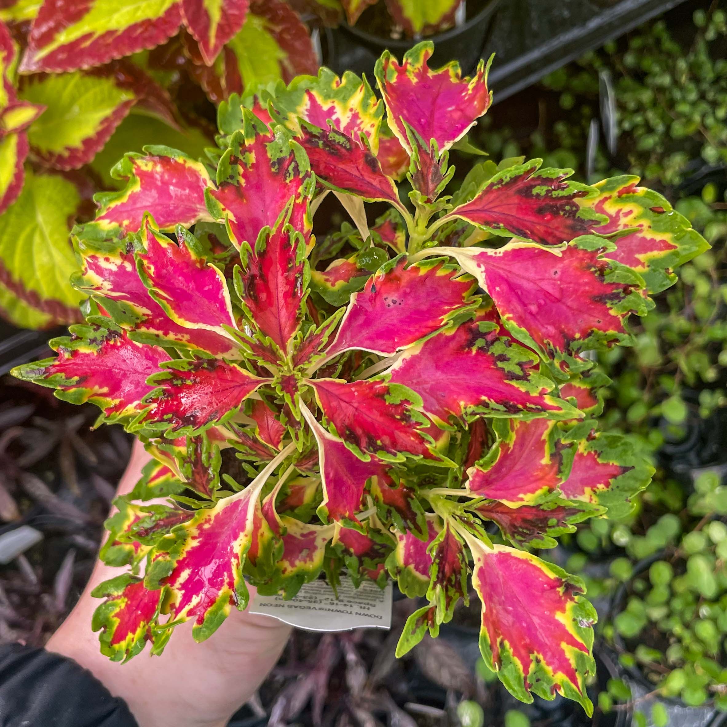Coleus Down Town™ ‘Vegas Neon’ lights up small spaces with jagged, soft rose leaves edged in green, purple, and flecks of gold. In brighter light, the center deepens to a vibrant magenta-rose for even more impact.