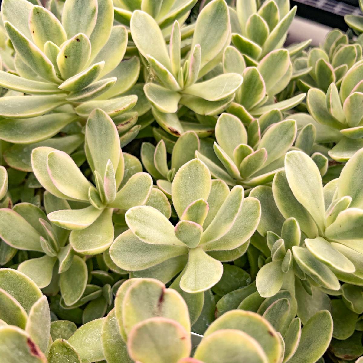 Variegated Money Maker Crassula is compact form of Jade Plant with oval-shaped, mounding, slightly fuzzy succulent foliage with creamy yellow variegation. The leaf edges will flush pink when happily stressed!