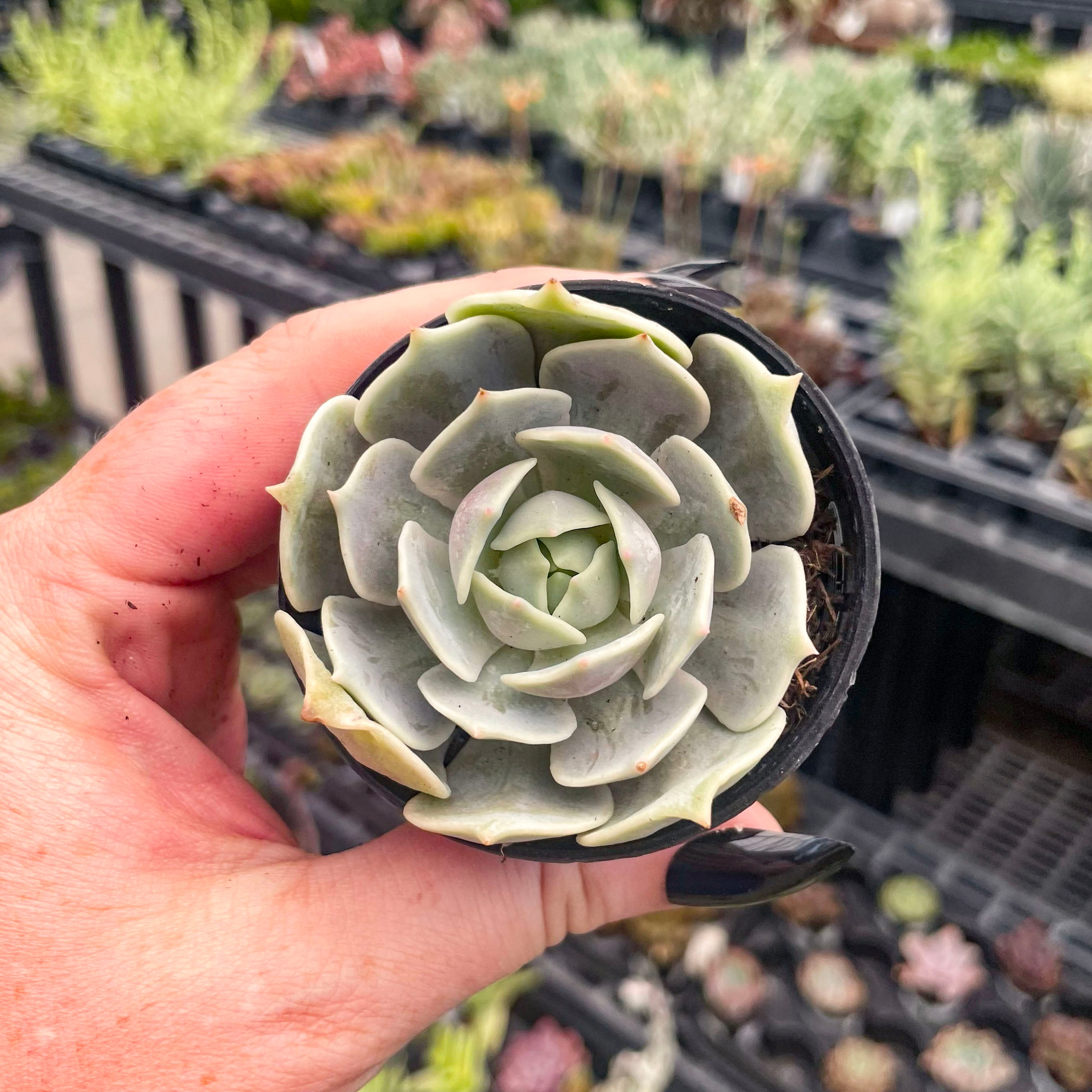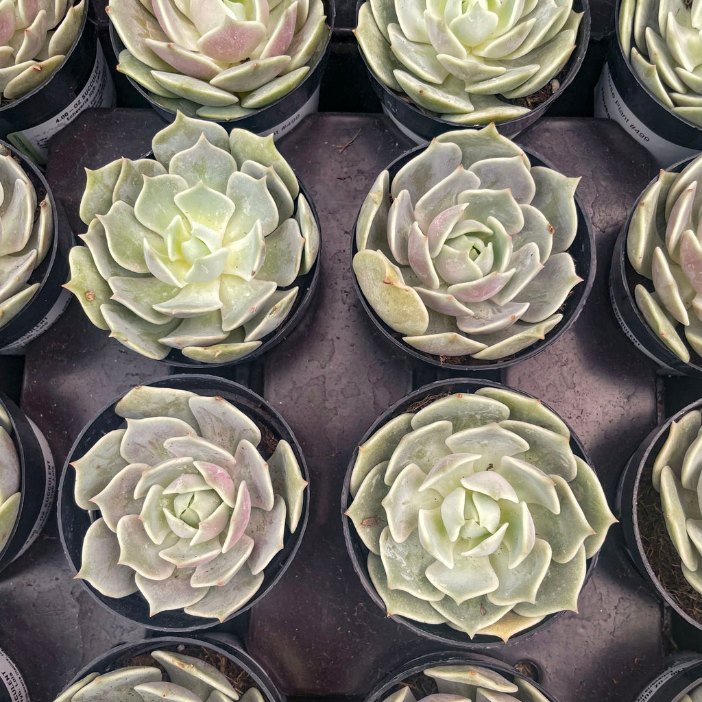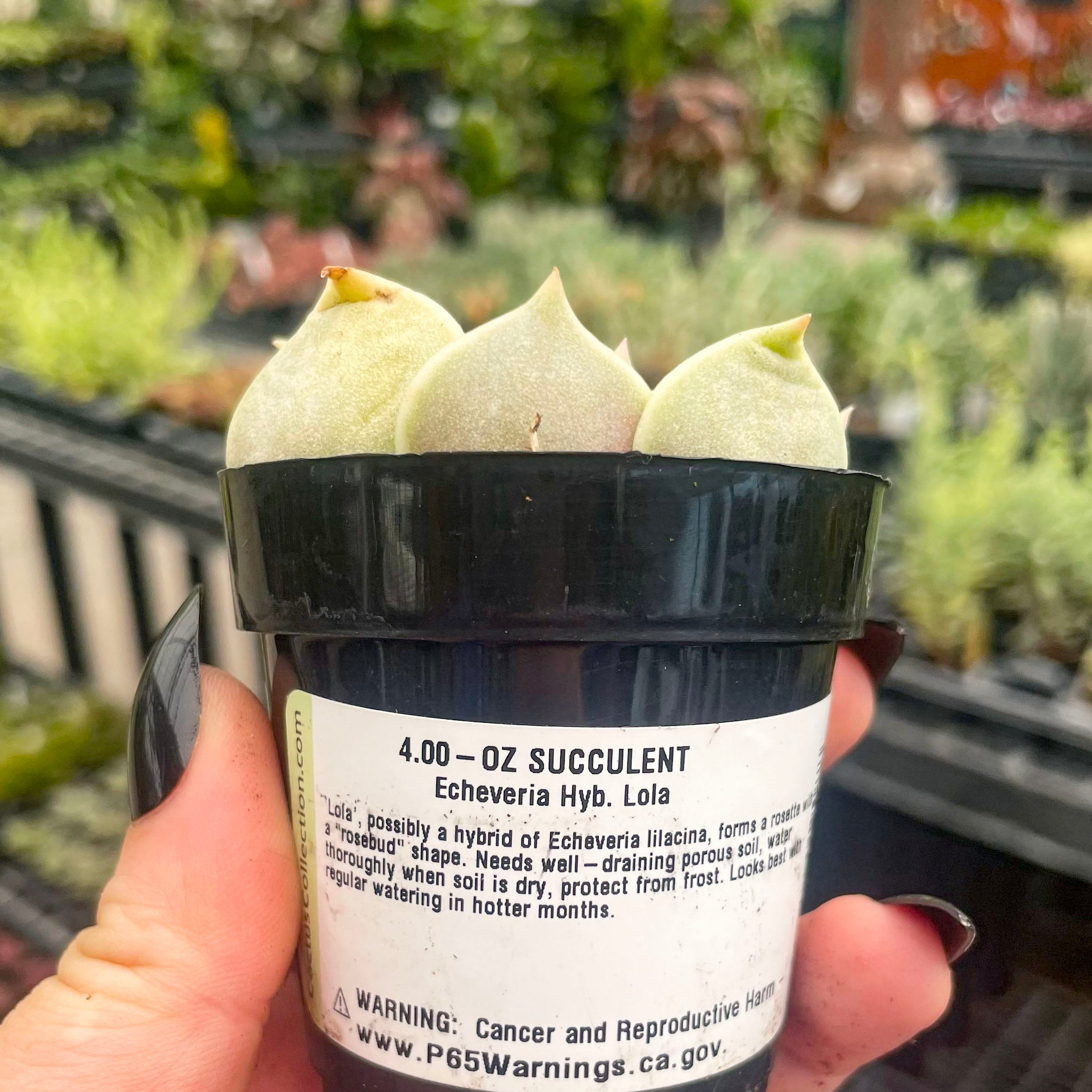 Giving the impression of alabaster wax, leaves are silvery white marble and pale green with a blush of pinkish violet and tipped with rose. Flowers are bell-shaped and peach. Succulent fans just might start humming a ’60s pop song after planting theirs. ‘Lola’ is an absolute dream in dish gardens, bouquets, and other decorative arrangements, as well as in gardens in temperate climates.