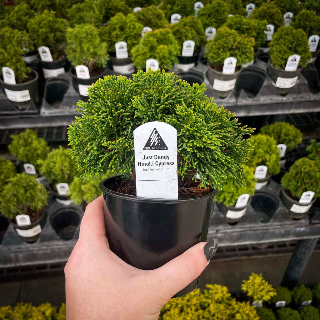 ‘Just Dandy’ is a compact Hinoki cypress that showcases dense, finely textured foliage in low, rounded sprays. Despite the tight, miniature-like appearance of its foliage, this versatile conifer grows faster than expected, maturing to beach-ball size in just a few years rather than decades.