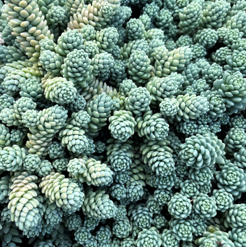 A charming, low-growing succulent that forms dense mats of silvery blue foliage, creating a soft, cushion-like look wherever it’s planted. Its tiny, rounded leaves give it a delicate texture that contrasts beautifully with other succulents, and in season it produces airy clusters of small white flowers that float above the plant for an extra pop of interest.
