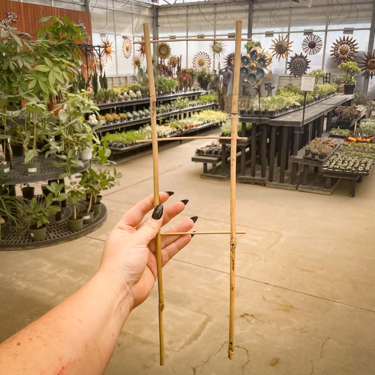 Natural bamboo flair trellis with two vertical stakes.