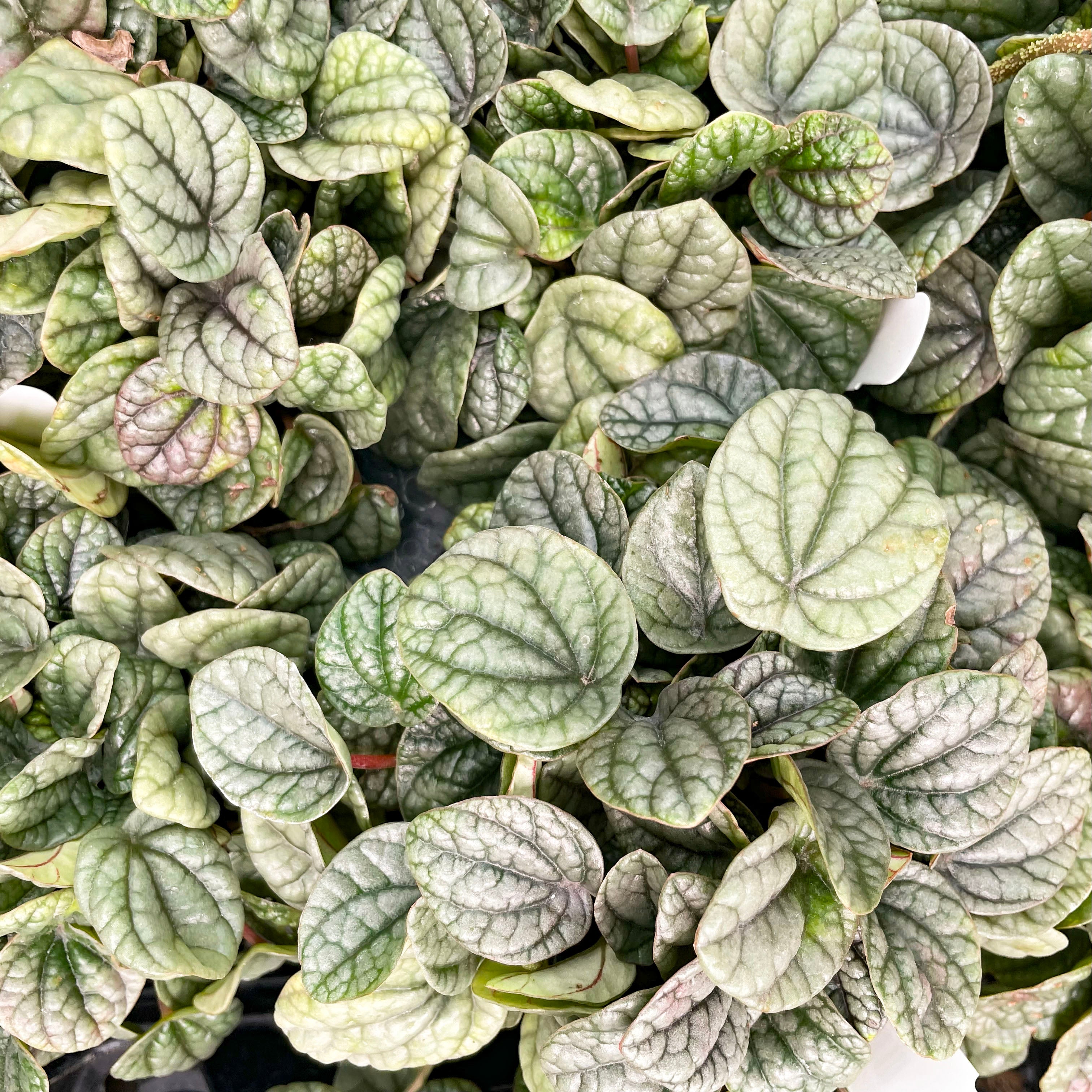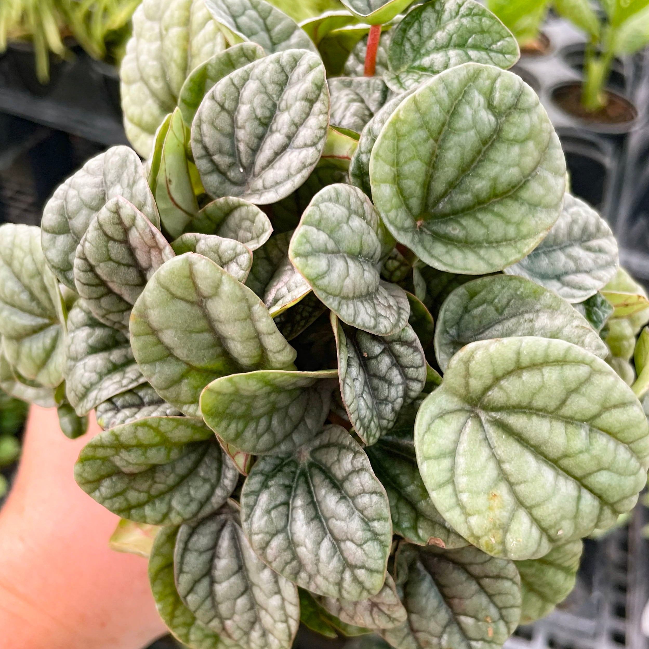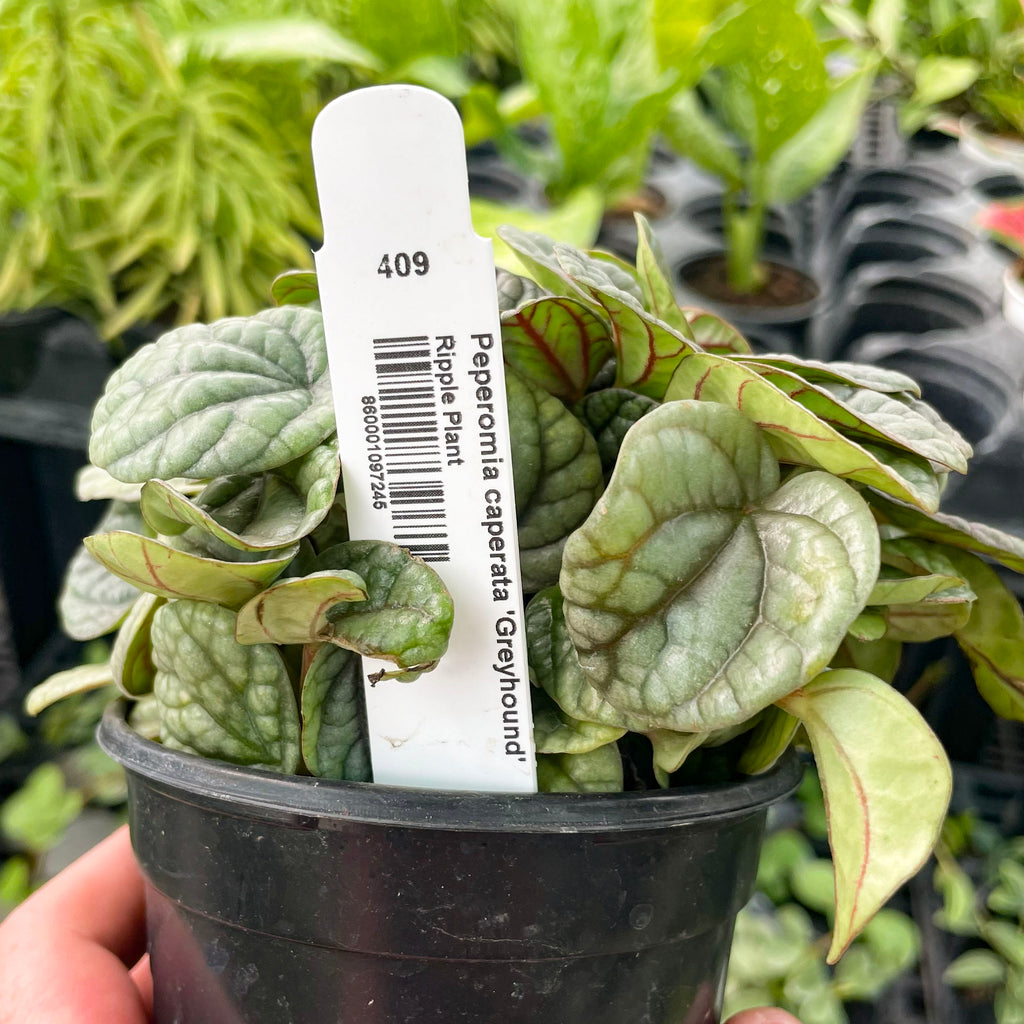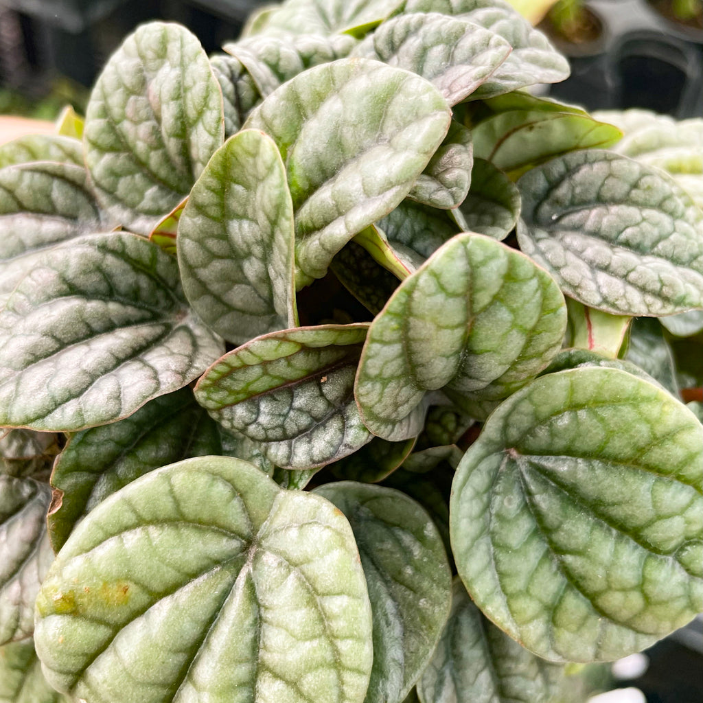 Peperomia ‘Greyhound’ is a striking little houseplant with sleek, silvery-green leaves etched with deep green veins. Its heart-shaped foliage has a delicate, almost metallic look that makes it stand out in any plant collection. A compact variety of Peperomia caperata, this plant is perfect for small spaces, fairy gardens, or tucked into terrariums.