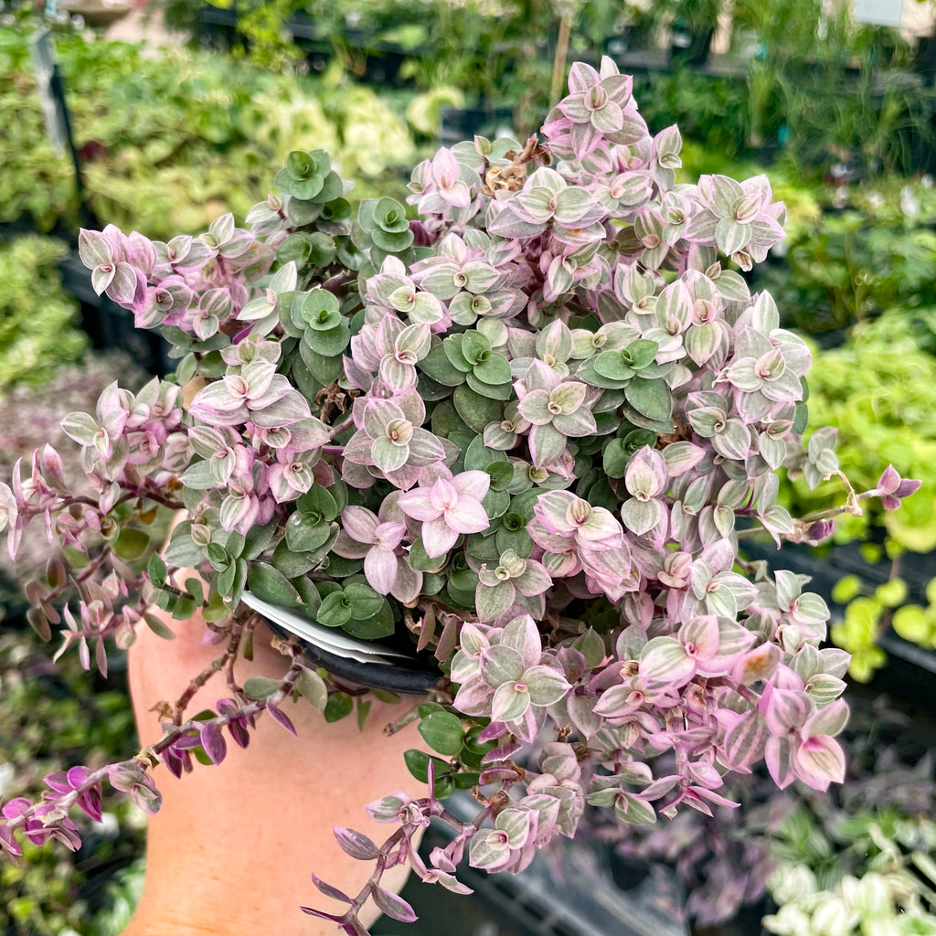 Pink Lady Turtle Vine is a low-growing succulent with stems full of small, round, waxy leaves. Leaves vary in color from green-striped, pinkish, and cream with a burgundy underside. Also know as Creeping Inch Plant.