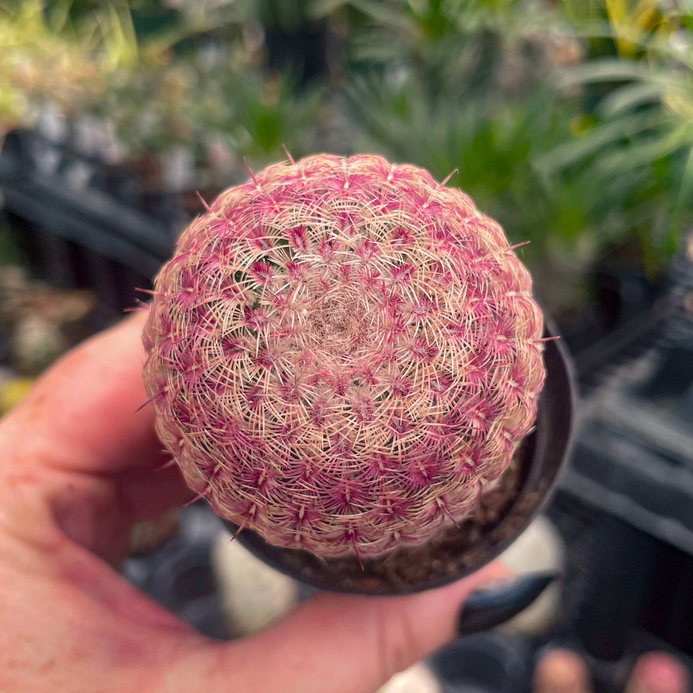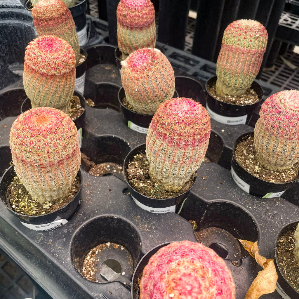The Rainbow Hedgehog Cactus is one of the prettiest hedgehogs you'll ever lay eyes on. Probably the most pink too. Beautiful deep rose flowers to 4" in diameter with white centers appear in late spring. The beauty of the spination is jaw-dropping. Echinocereus rigidissimus rubrispinus requires cactus soil with extra drainage, as is provided by the addition of extra pumice or perlite. A beautiful and rare species well worth the careful culture required for a healthy specimen. Requires care in watering; water sparingly in cold winter months and refrain from watering in times of high humidity. Water thoroughly when soil is dry to the touch, but make sure soil does not remain waterlogged.