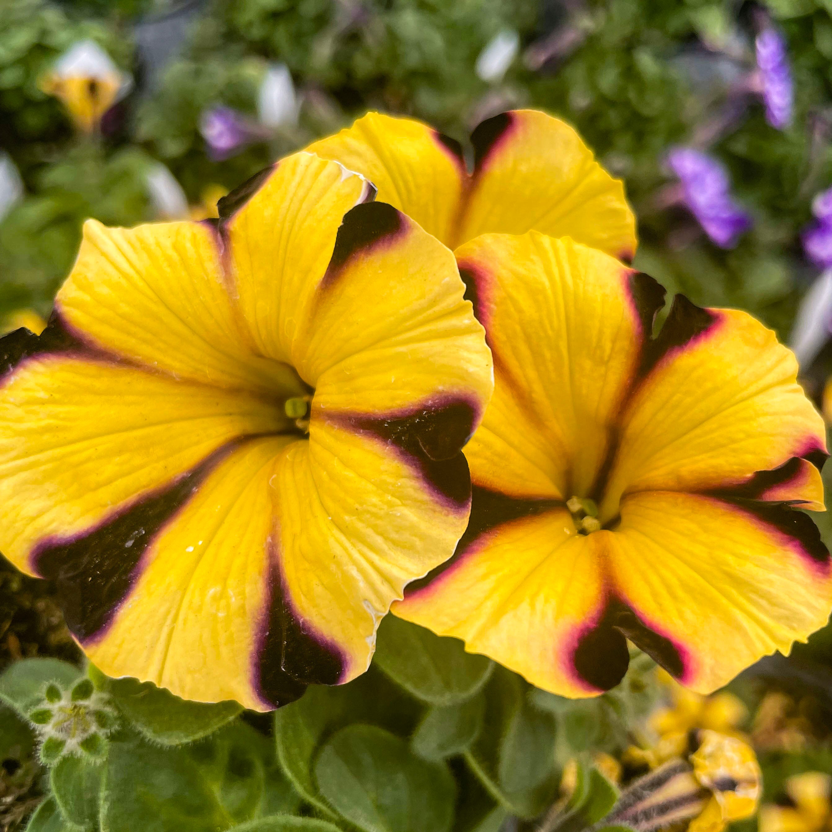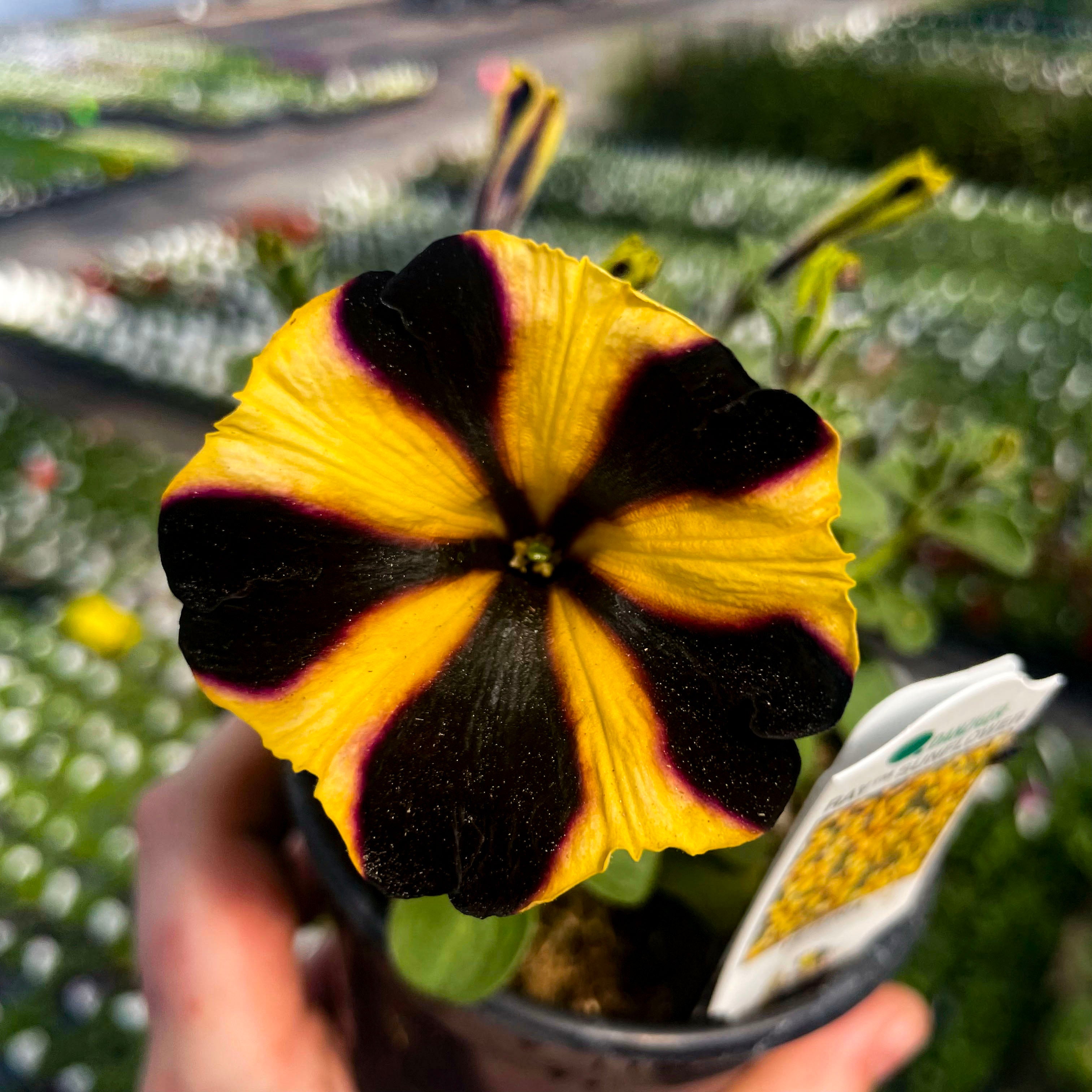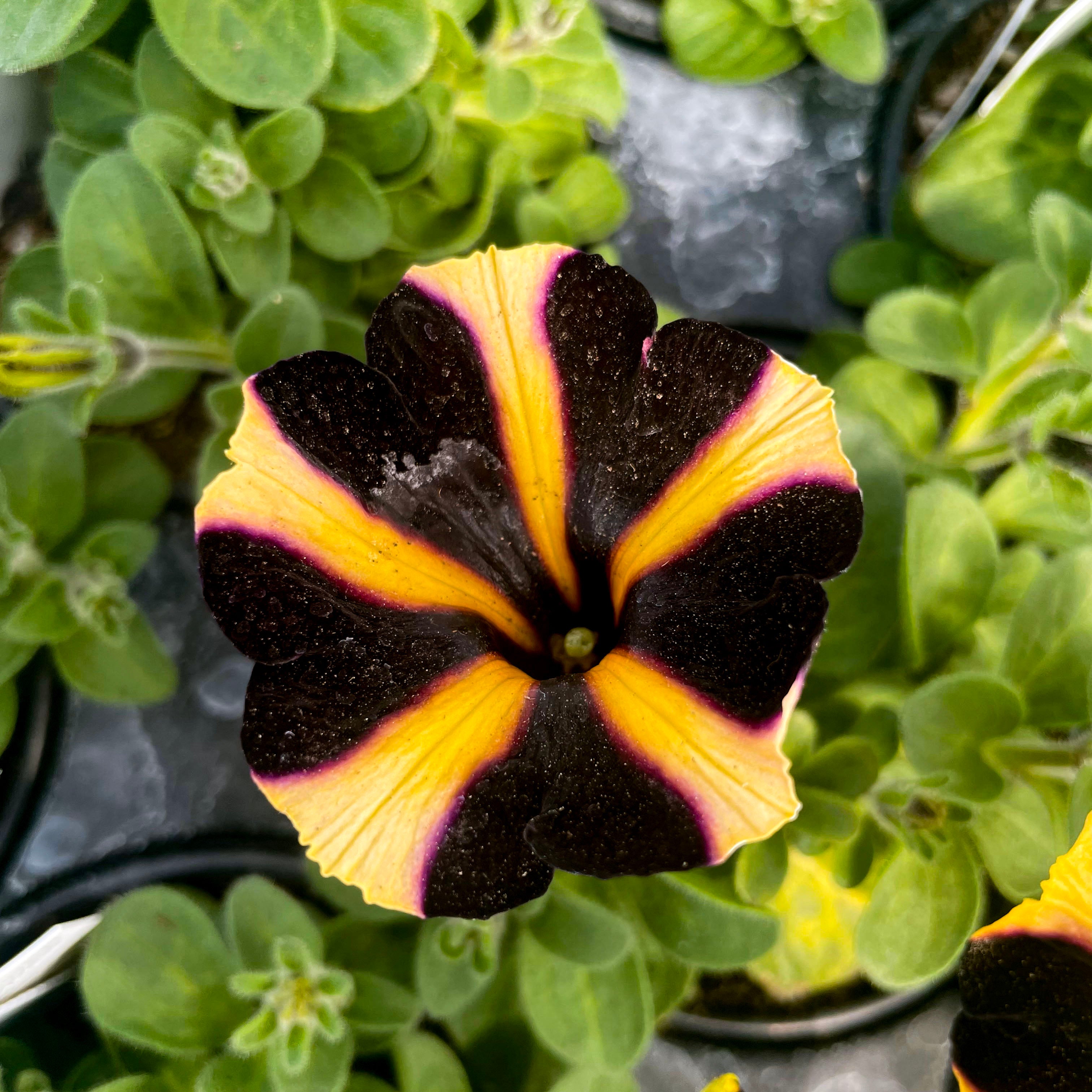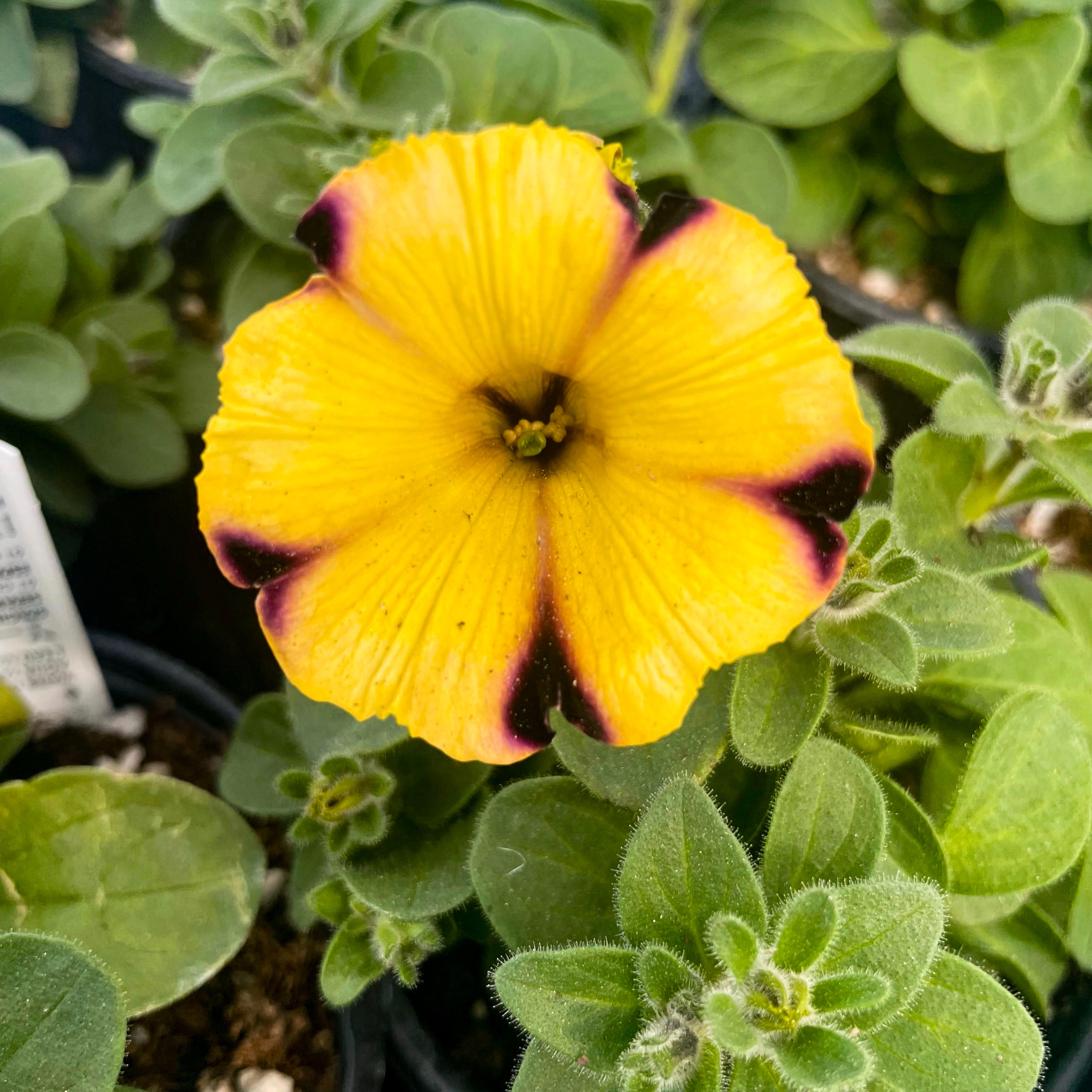 Petunia 'Ray™ Sunflower Improved' is a stunning standout with its brilliant golden-yellow petals accented by deep black-purple starburst markings. These large, eye-catching blooms bring bold contrast and sunny cheer to any garden setting. With a tidy mounding habit and strong performance, it’s an ideal choice for hanging baskets, window boxes, and patio containers. This petunia blooms continuously through heat, wind, and rain, offering nonstop color from spring to fall. Ray™ Sunflower adds a bright, playful twist to your sunny space with minimal care required.