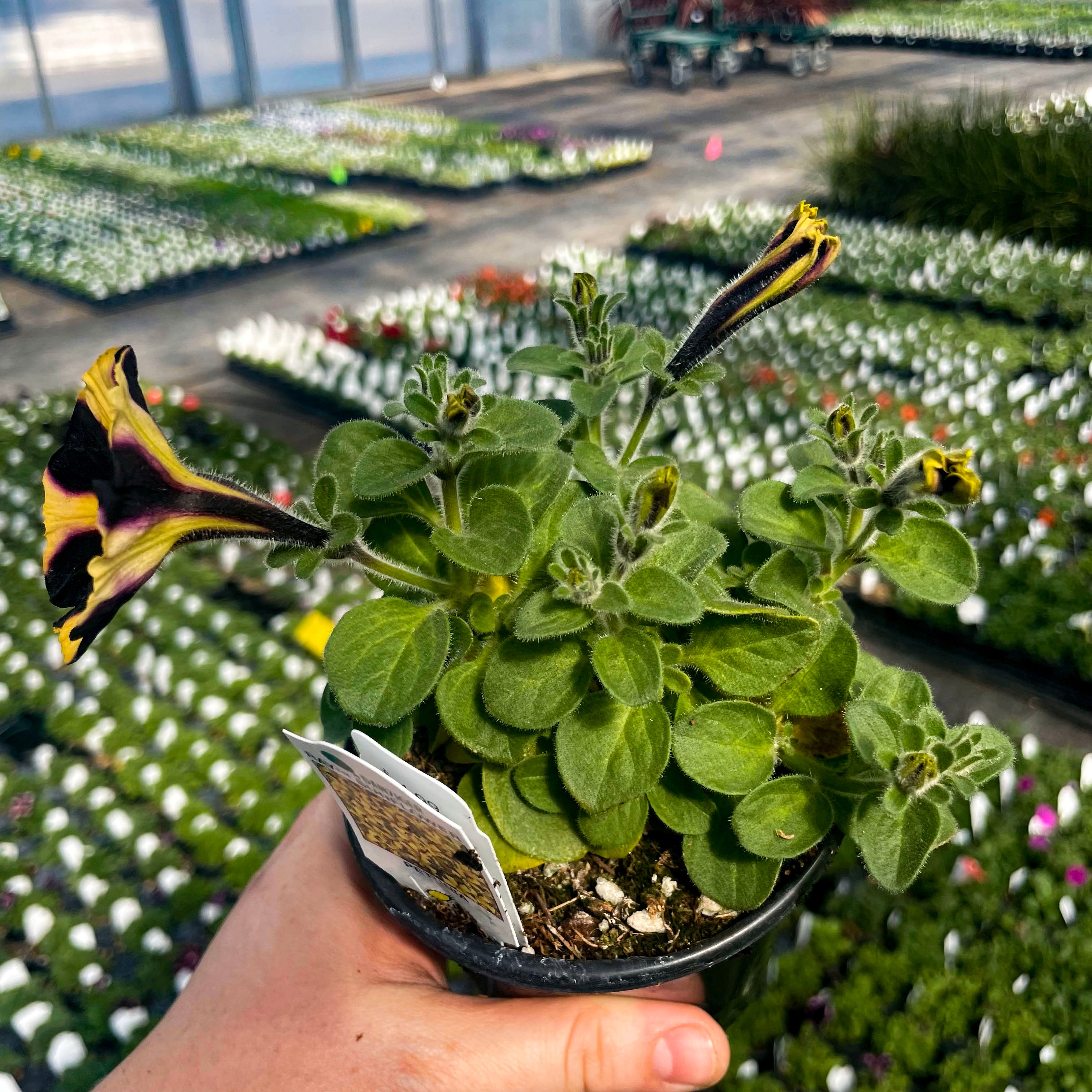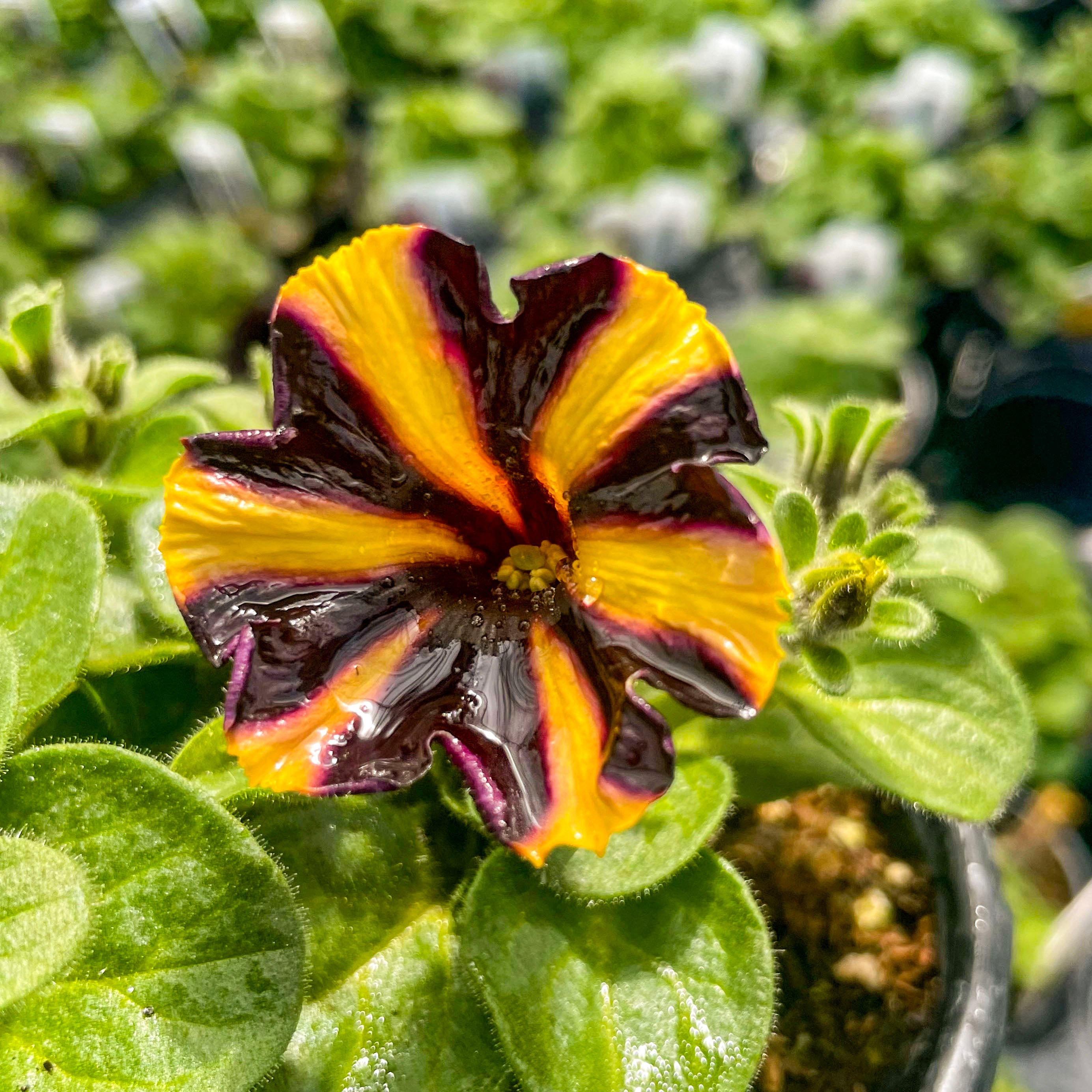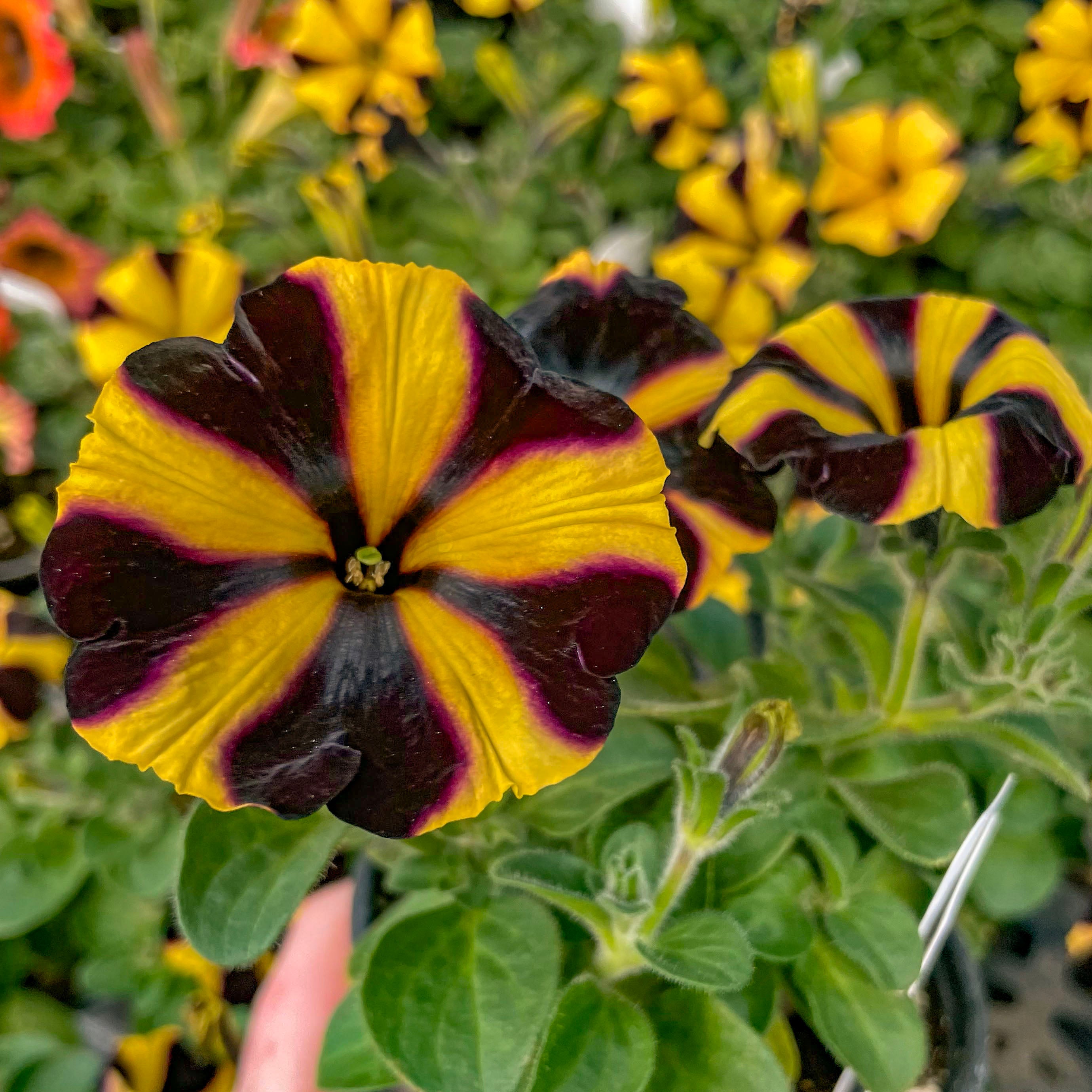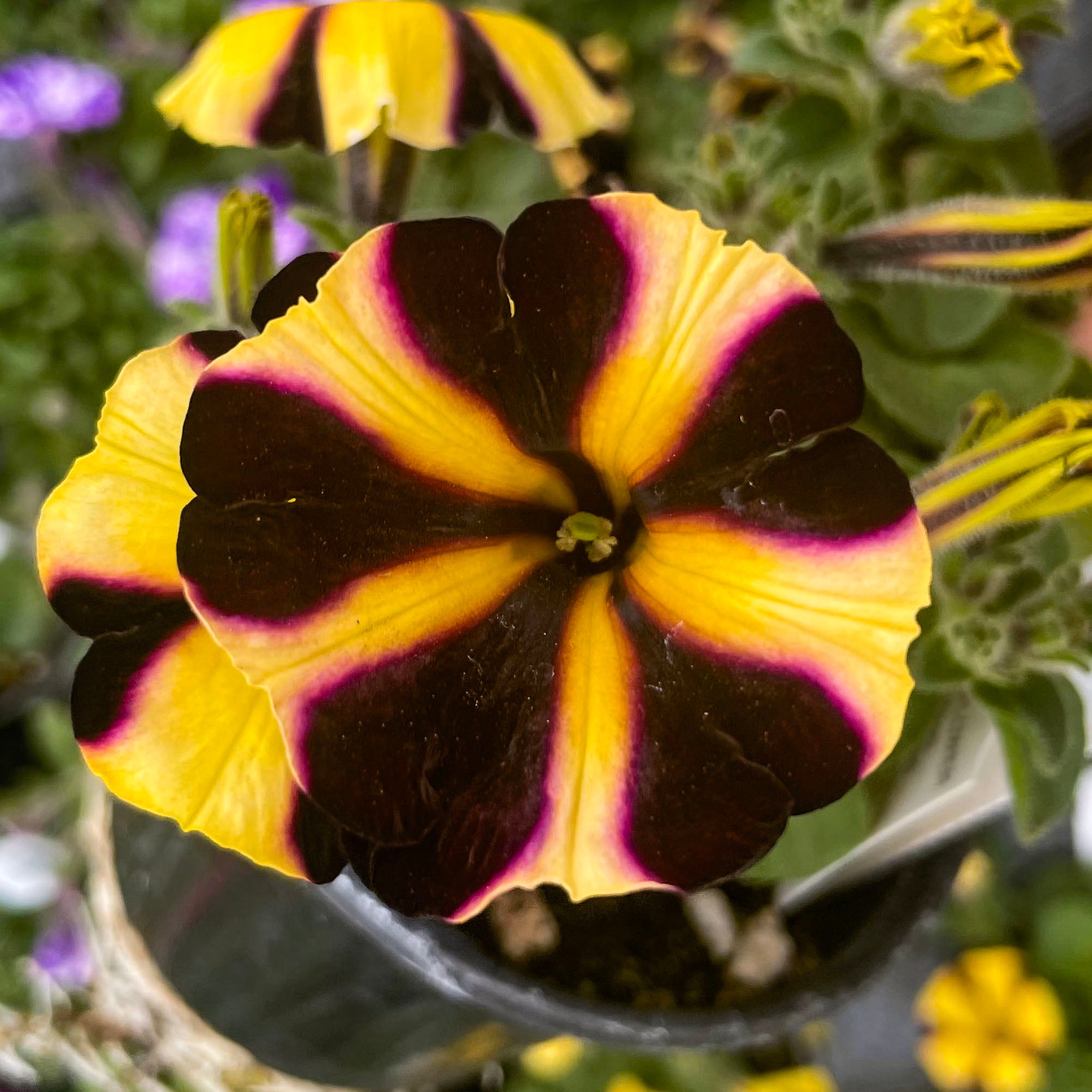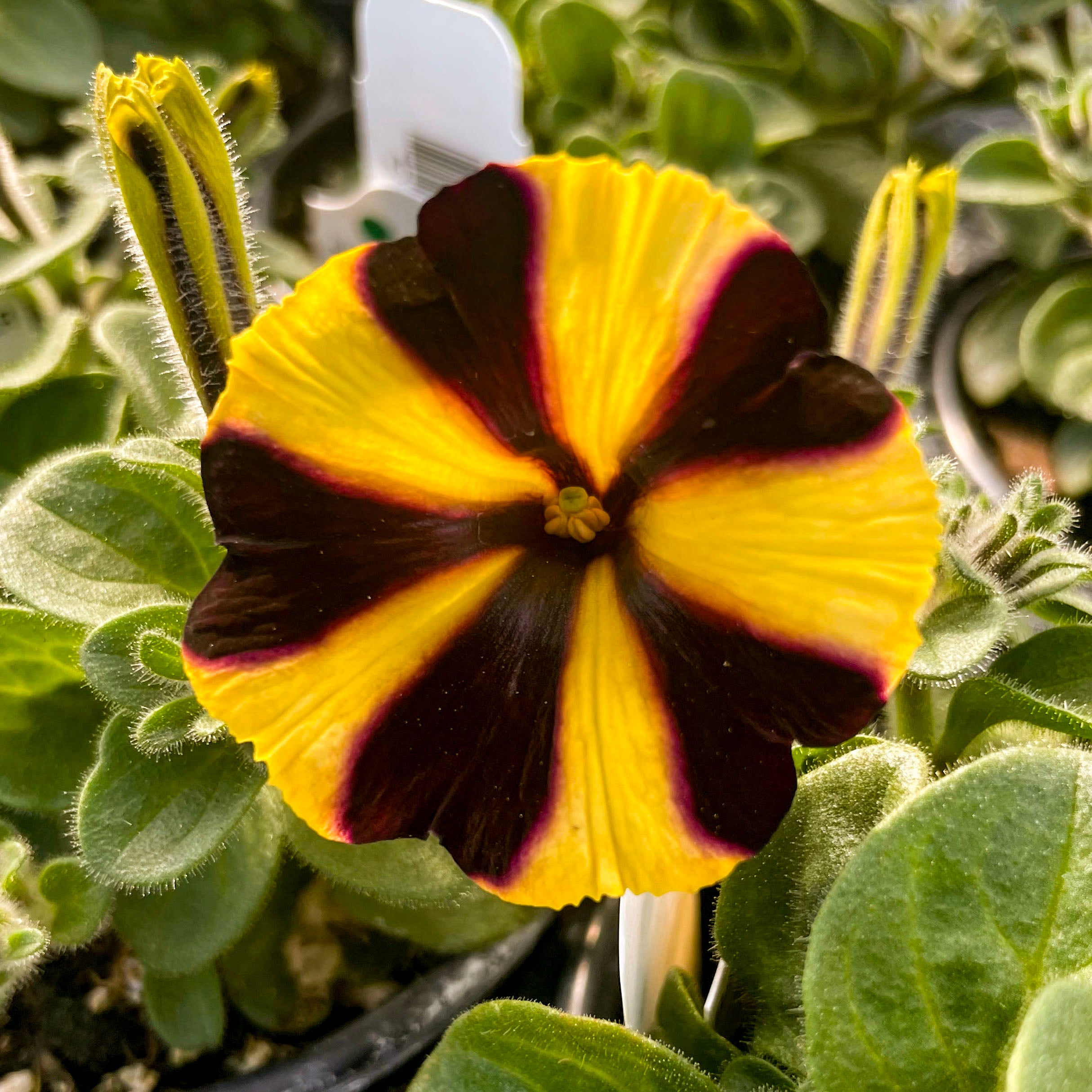 Petunia 'Ray™ Sunflower Improved' is a stunning standout with its brilliant golden-yellow petals accented by deep black-purple starburst markings. These large, eye-catching blooms bring bold contrast and sunny cheer to any garden setting. With a tidy mounding habit and strong performance, it’s an ideal choice for hanging baskets, window boxes, and patio containers. This petunia blooms continuously through heat, wind, and rain, offering nonstop color from spring to fall. Ray™ Sunflower adds a bright, playful twist to your sunny space with minimal care required.