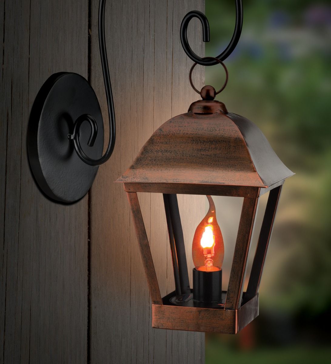 Classic styling with aged-looking metal, these lanterns emit a soft warm glows from the flickering LED solar light from the flame shaped glass bulb. The swirl shaped metal hanger and sturdy mounting bracket will secure these to the side of any home or fence. Can also hang from Regal's new shepherd hook stakes, or just place on the patio table. Available in three styles.