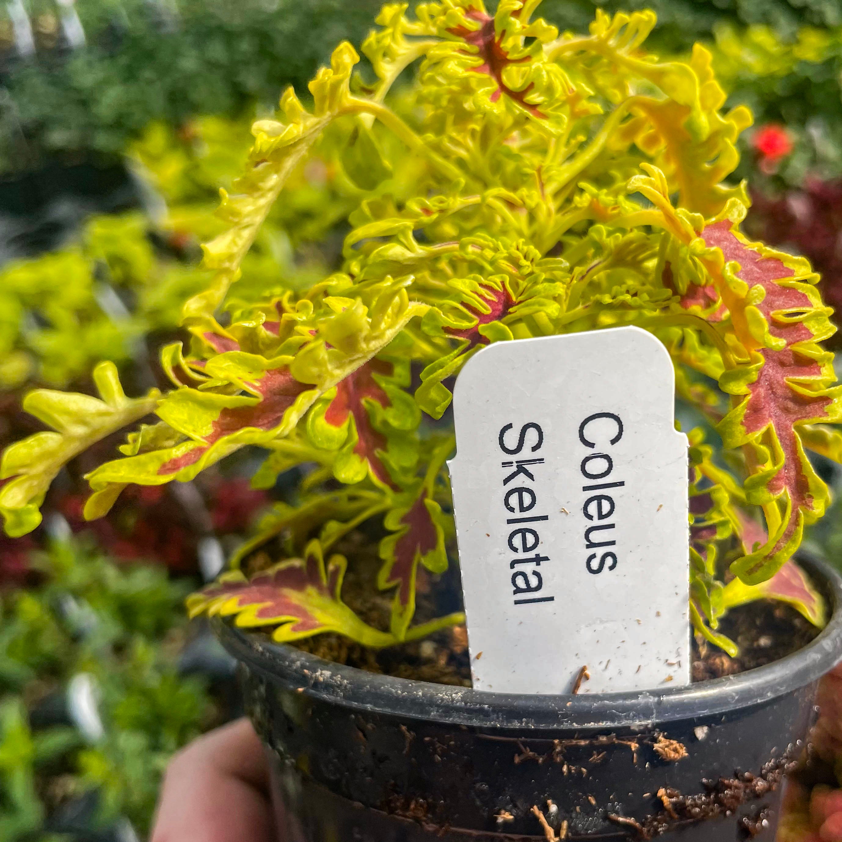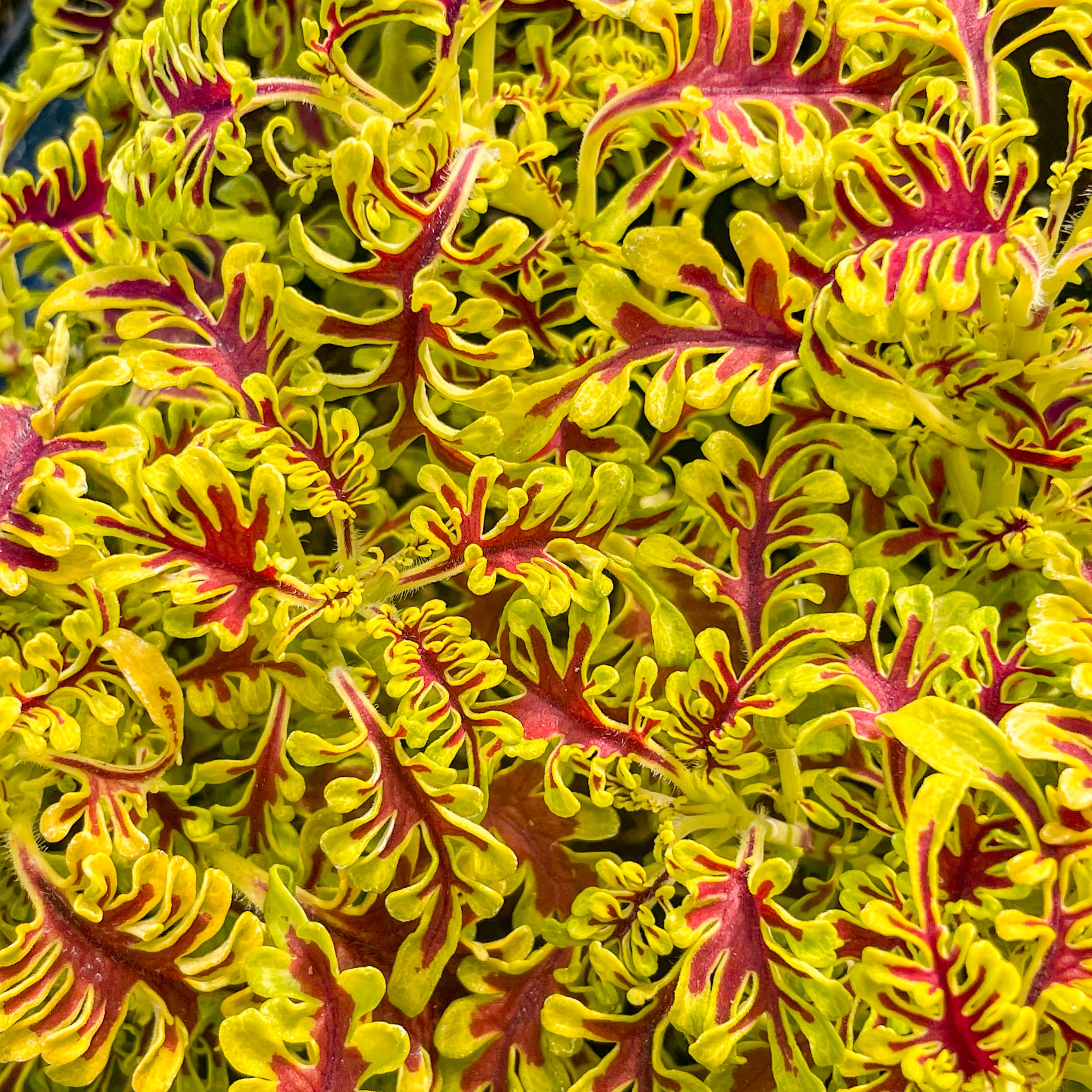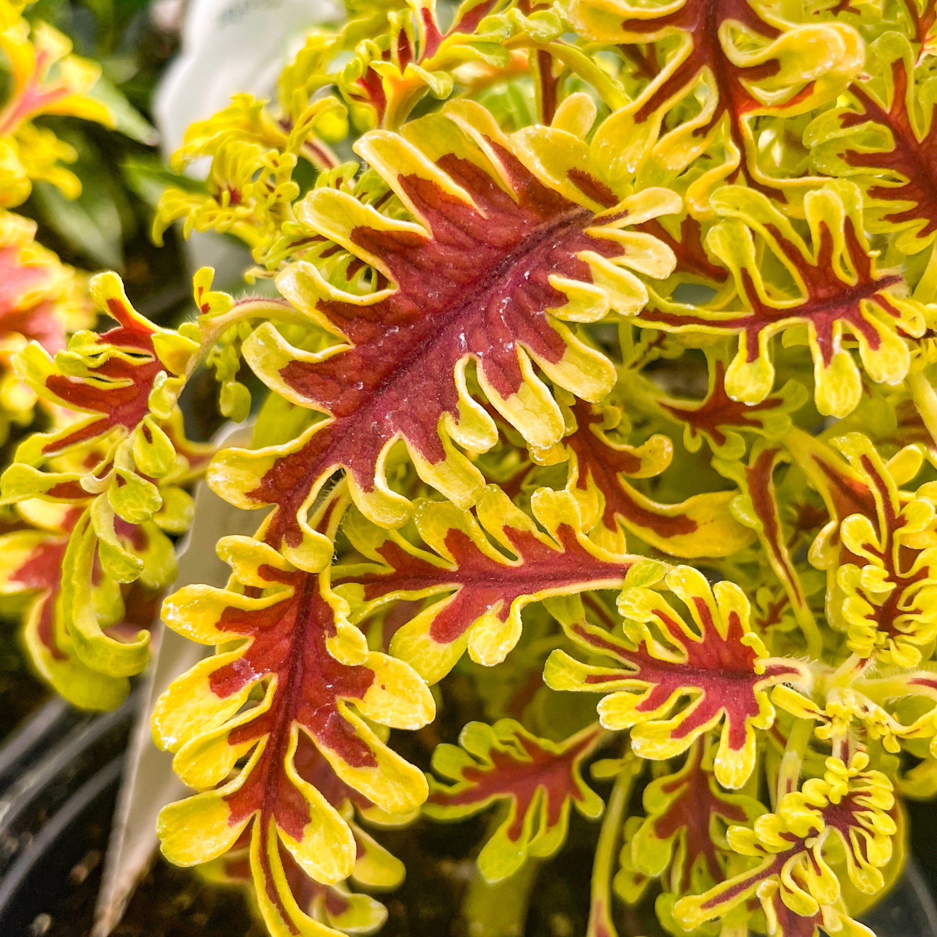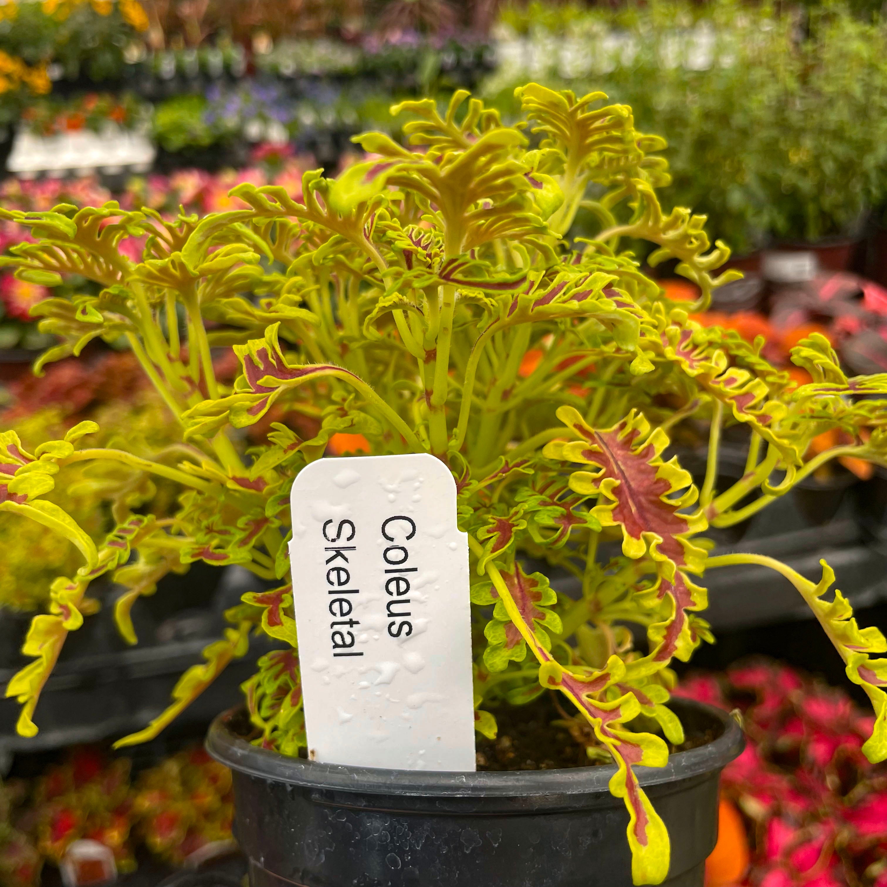 Solenostemon scutellarioides 'Skeletal' lives up to its name with uniquely lobed, fishbone-style leaves that create dramatic texture and high visual impact. This striking coleus adds architectural flair to containers, hanging baskets, or shady garden beds, and also thrives as an unusual and envy-inducing houseplant. Its bold form pairs beautifully with both vibrant bloomers and other foliage plants, offering year-round interest indoors or out. Easy to grow and shade-tolerant, Skeletal is a true conversation piece for plant lovers.