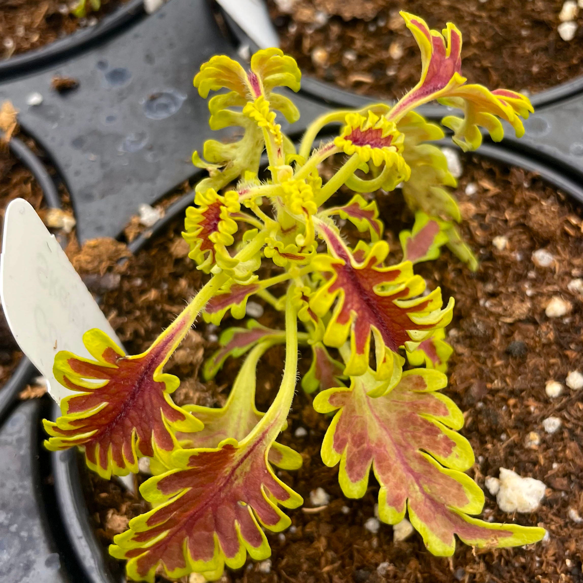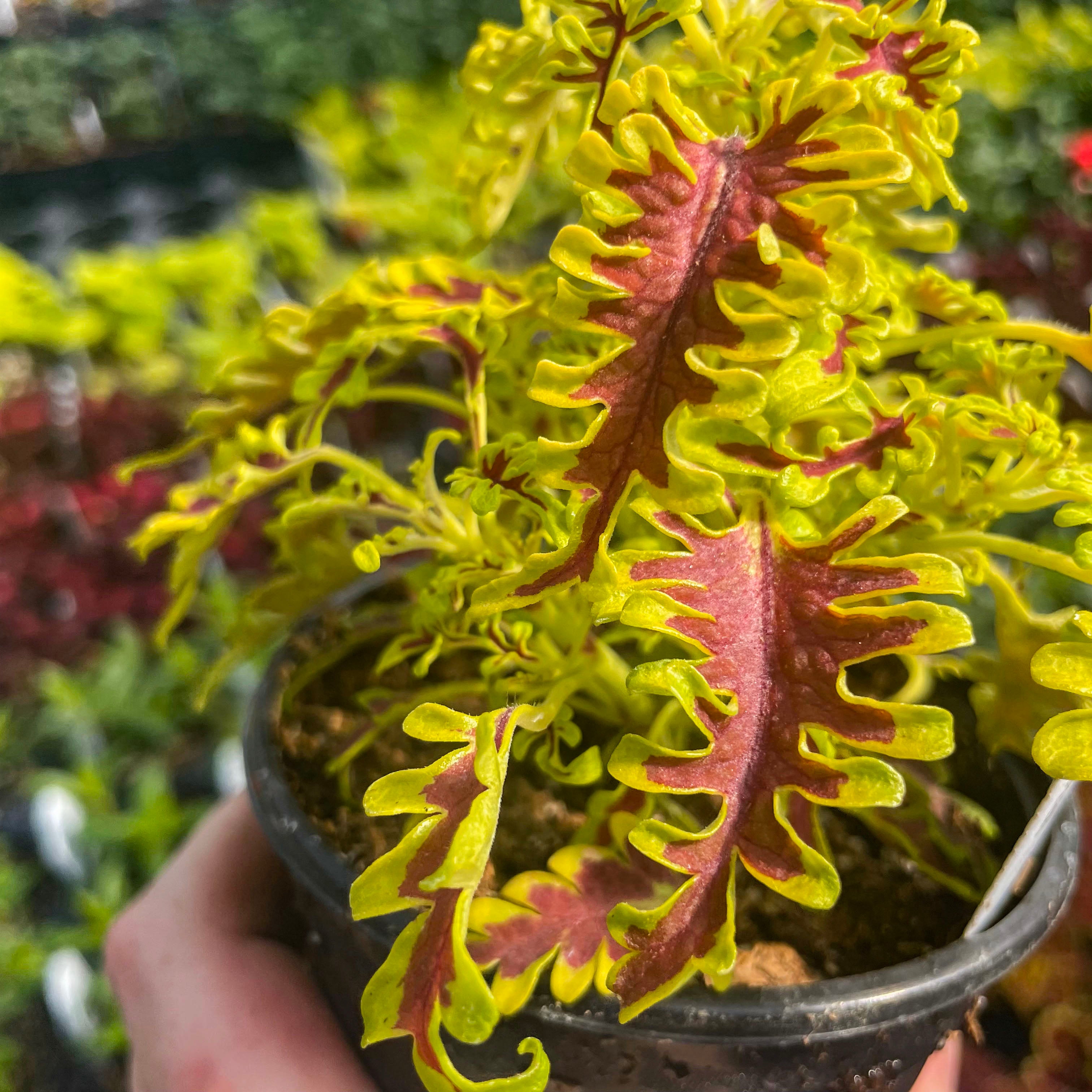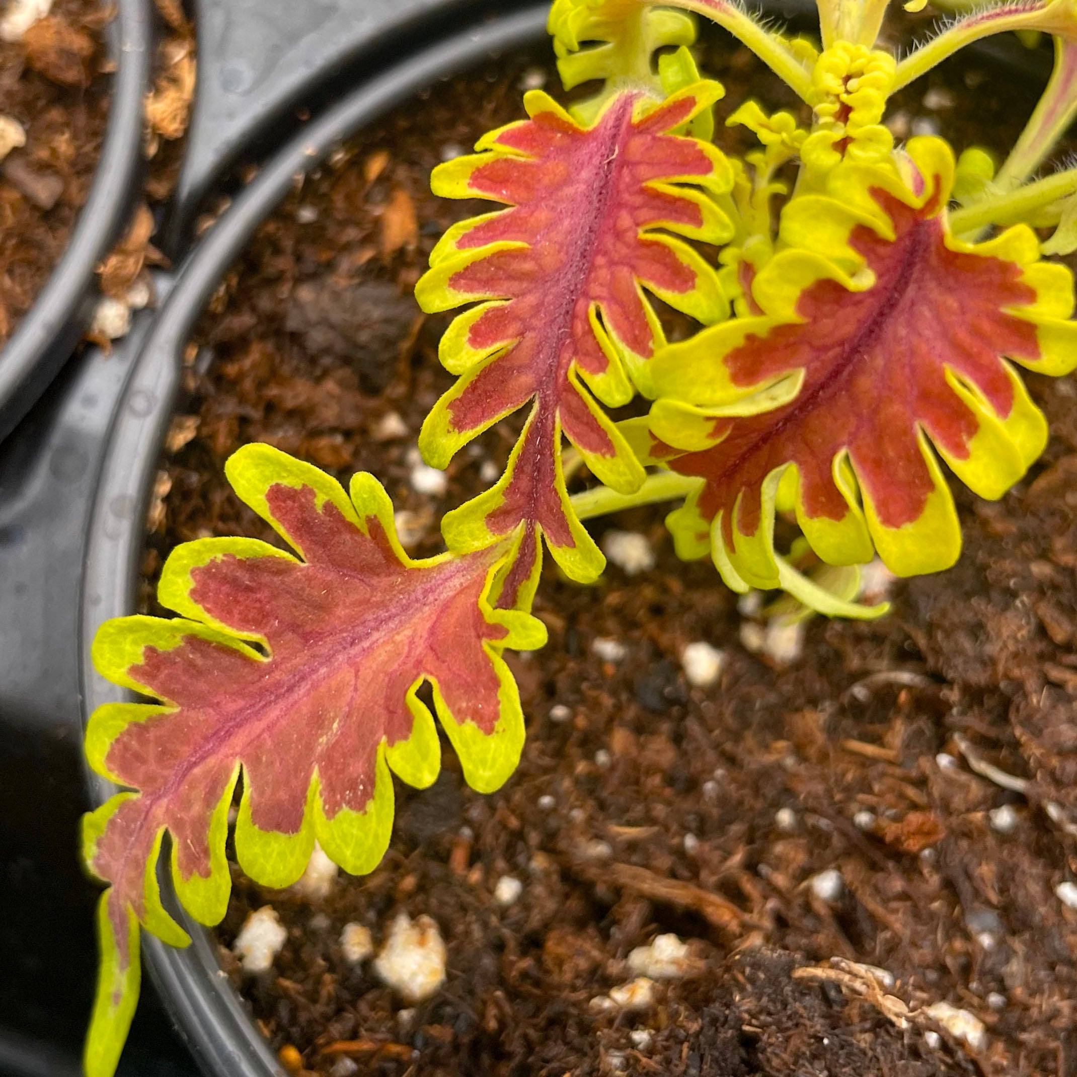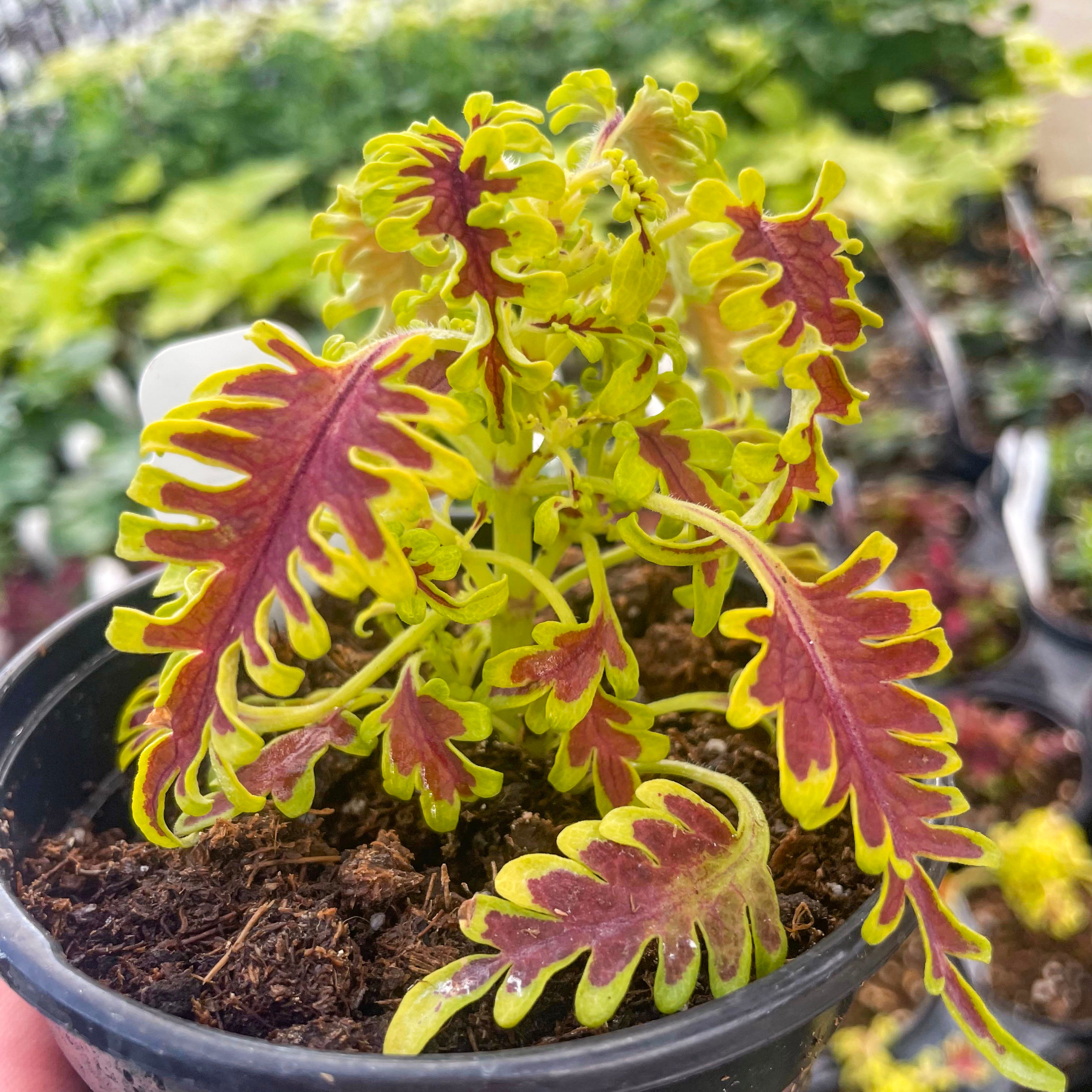 Solenostemon scutellarioides 'Skeletal' lives up to its name with uniquely lobed, fishbone-style leaves that create dramatic texture and high visual impact. This striking coleus adds architectural flair to containers, hanging baskets, or shady garden beds, and also thrives as an unusual and envy-inducing houseplant. Its bold form pairs beautifully with both vibrant bloomers and other foliage plants, offering year-round interest indoors or out. Easy to grow and shade-tolerant, Skeletal is a true conversation piece for plant lovers.