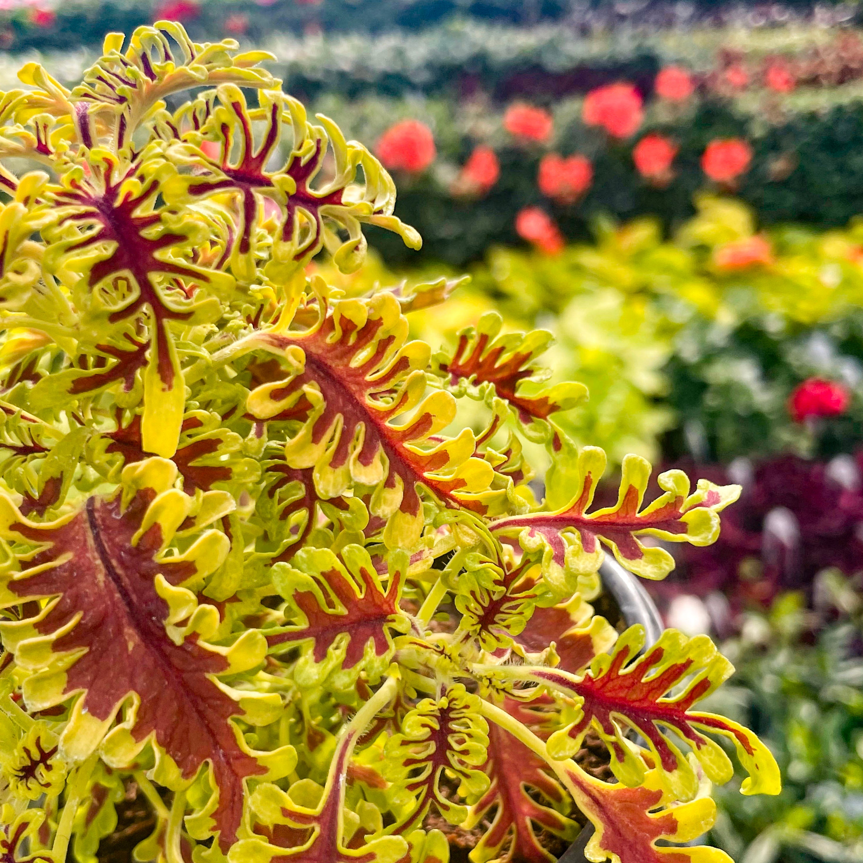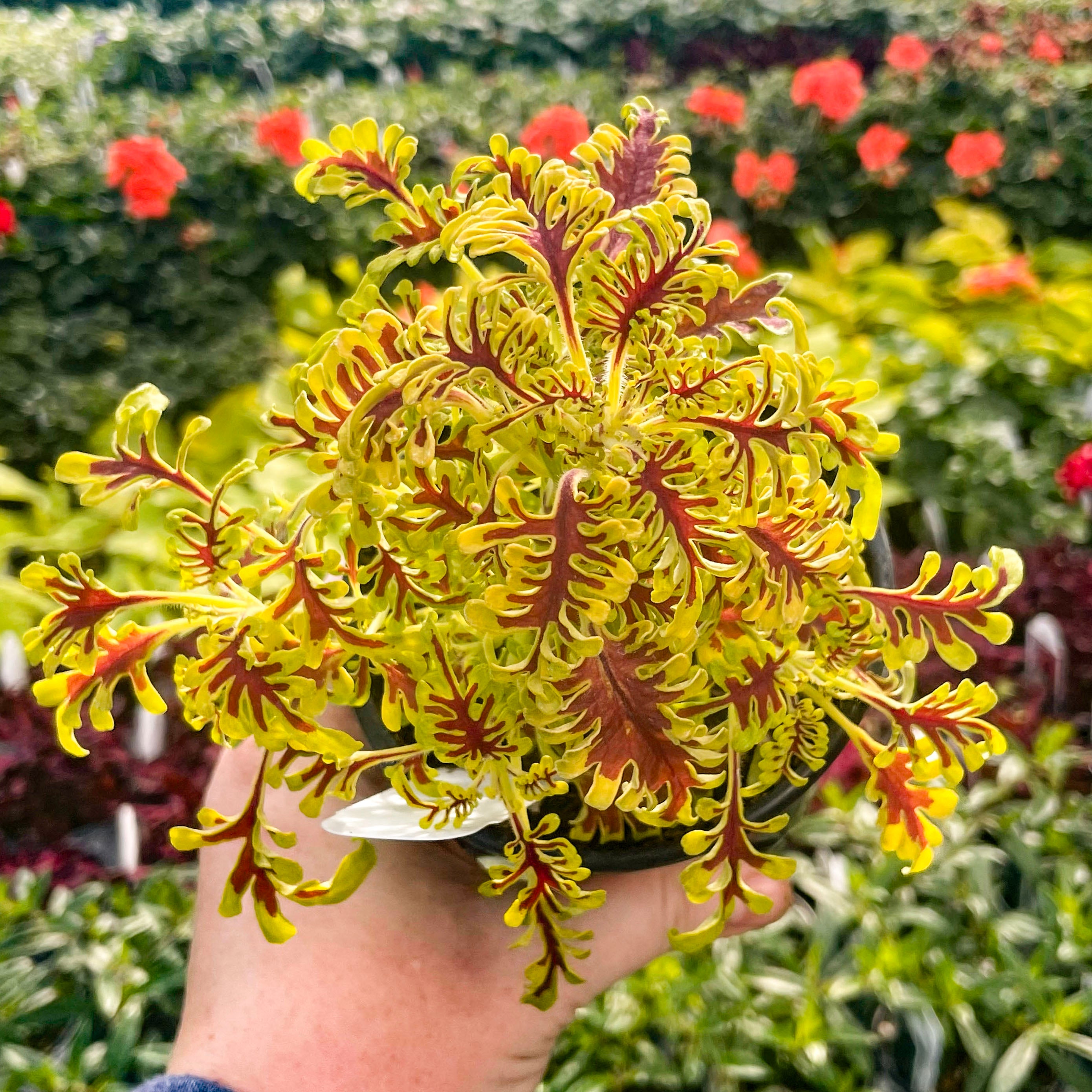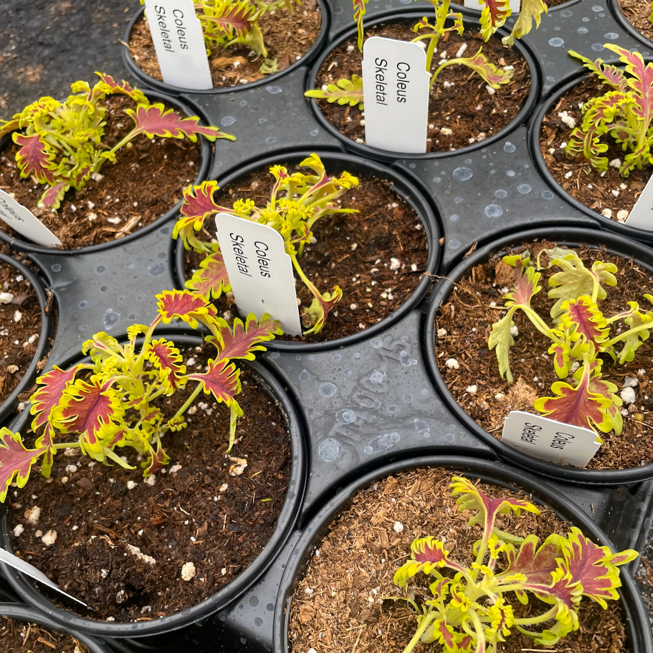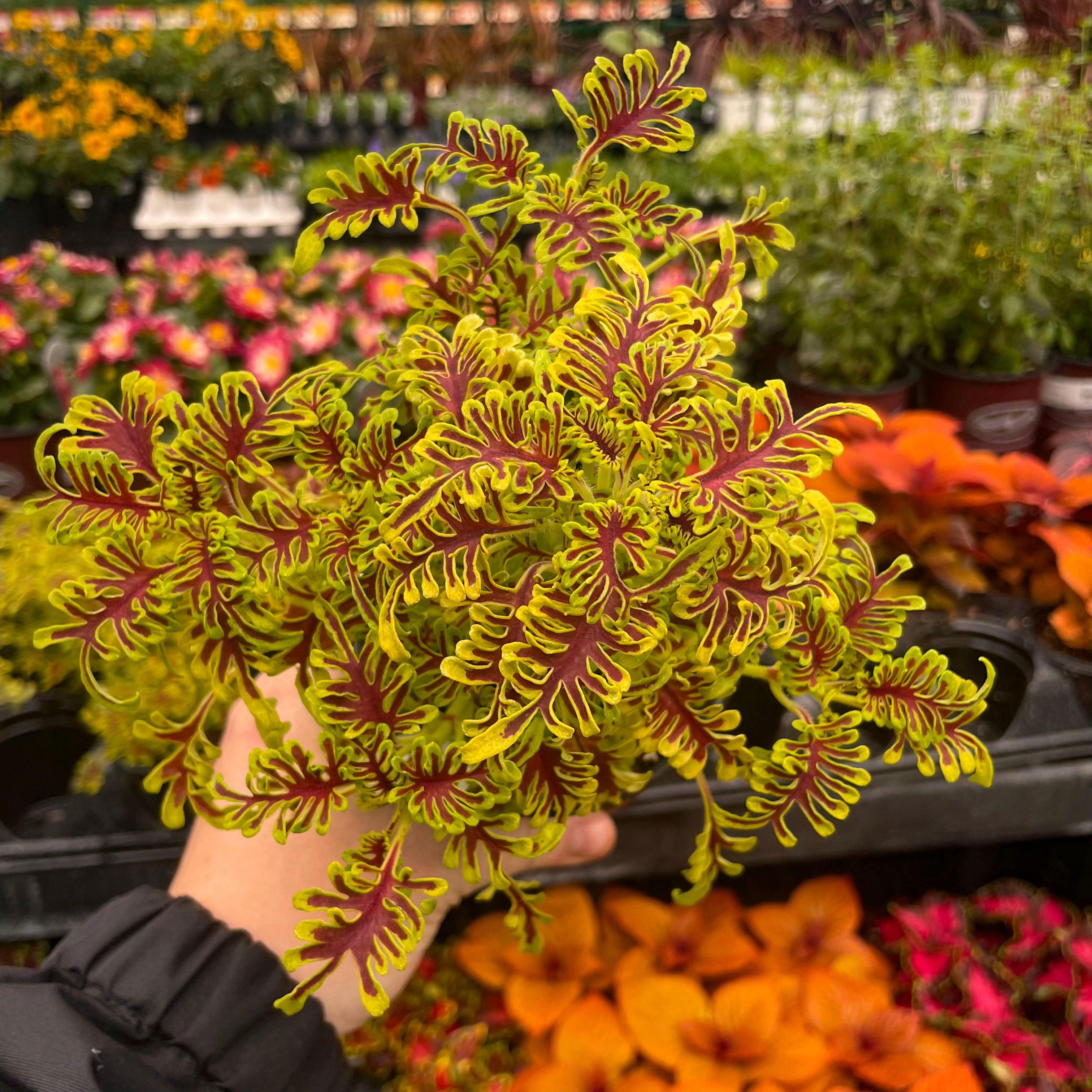 Solenostemon scutellarioides 'Skeletal' lives up to its name with uniquely lobed, fishbone-style leaves that create dramatic texture and high visual impact. This striking coleus adds architectural flair to containers, hanging baskets, or shady garden beds, and also thrives as an unusual and envy-inducing houseplant. Its bold form pairs beautifully with both vibrant bloomers and other foliage plants, offering year-round interest indoors or out. Easy to grow and shade-tolerant, Skeletal is a true conversation piece for plant lovers.