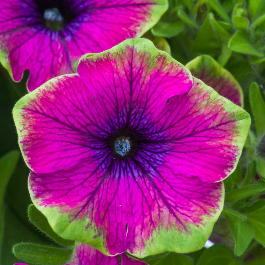 This eye-catching petunia may have slightly smaller blooms than some varieties, but it delivers serious impact. Each flower is outlined in a vivid green edge that pops beautifully against the foliage, setting the stage for rich magenta petals detailed with dark purple veining that draws your eye straight to the dramatic center.