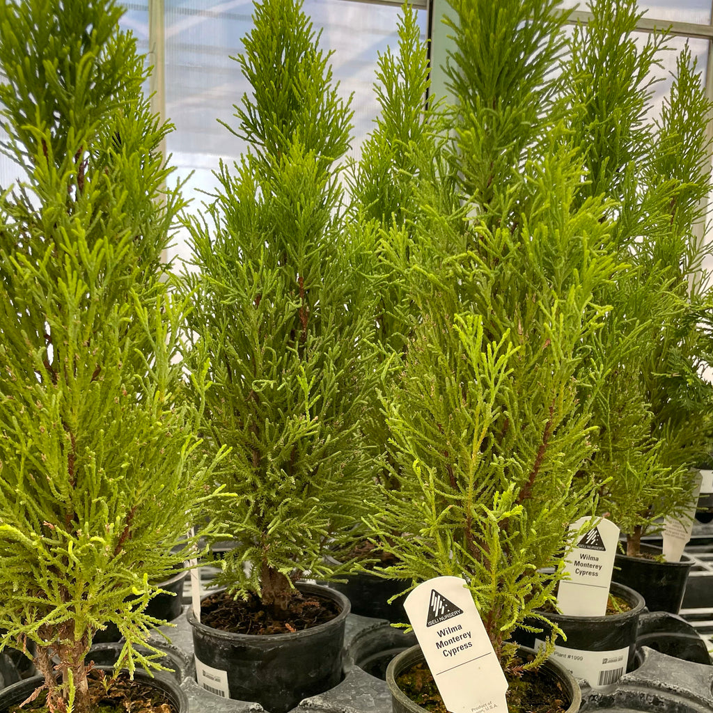 ‘Wilma’ Monterey Cypress is cherished for its vibrant yellow-to-chartreuse foliage and refreshing lemony fragrance. Its compact, upright habit makes it a versatile choice for various uses, including as a hedge, specimen plant, bonsai, or a container accent on patios or indoors.